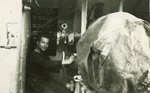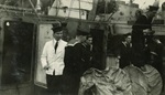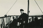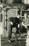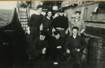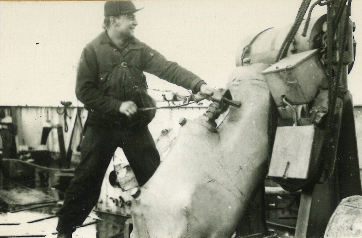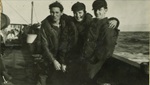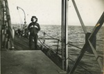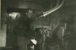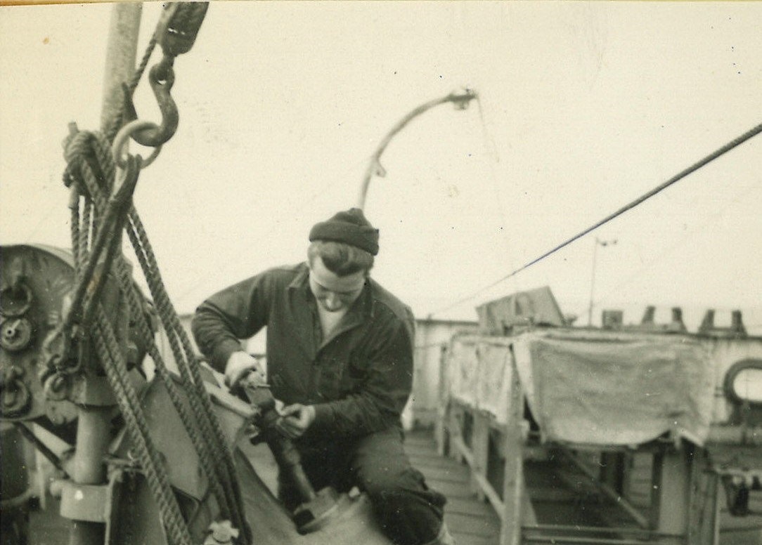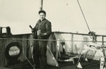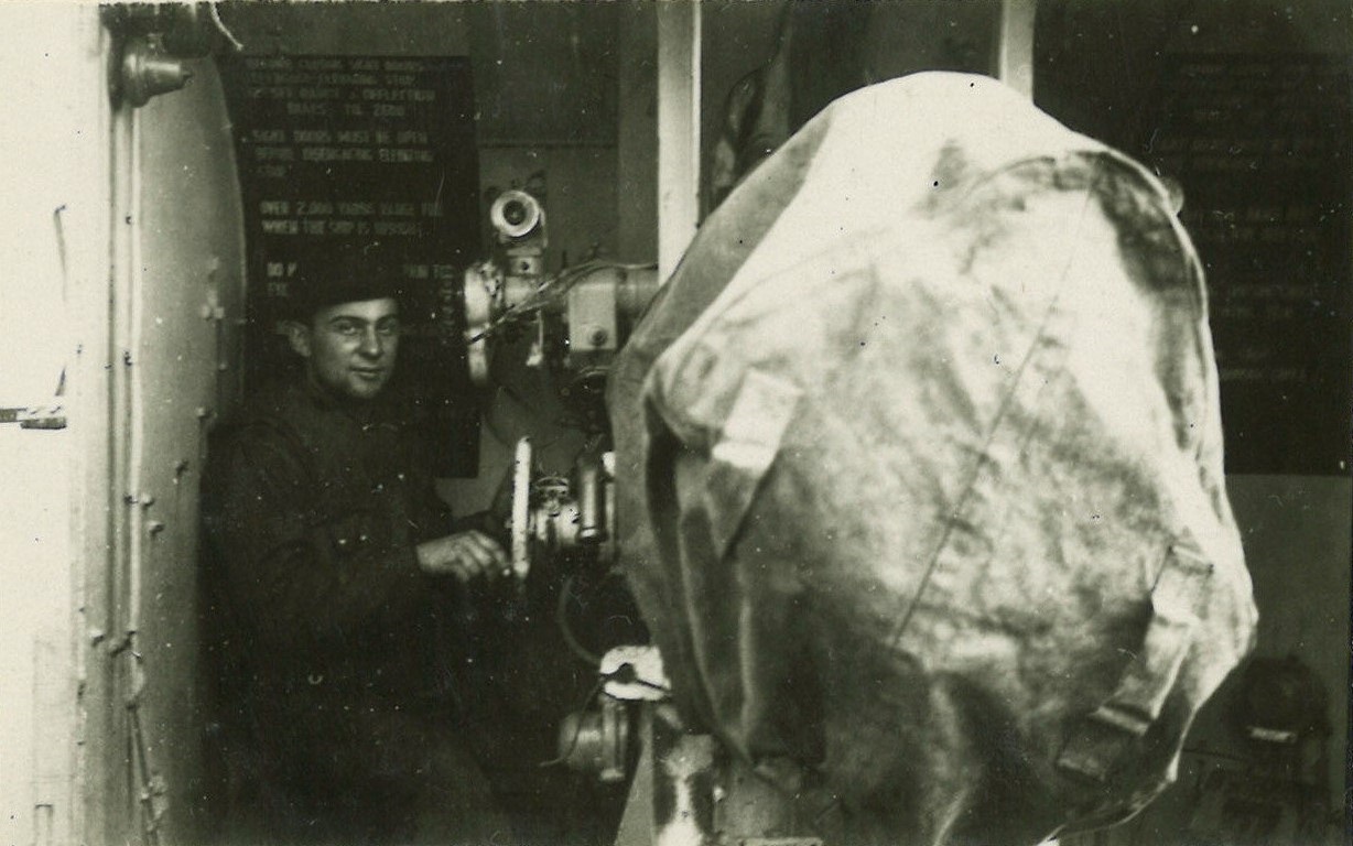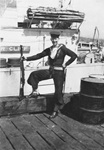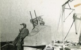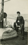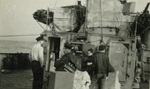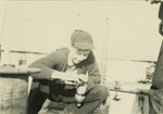 (WC56) Unidentified sailor sitting in front of a Kisby ring on HMCS COPPER CLIFF (WC57) Unidentified sailor posing by starboard depth charge thrower on HMCS COPPER CLIFF (WC58) Unidentified sailor painting ship on HMCS COPPER CLIFF (WC59) John W. Hughes working on starboard depth charge thrower firing mechanism on HMCS COPPER CLIFF (WC60) Unidentified sailor at the helm in the wheelhouse of HMCS COPPER CLIFF
