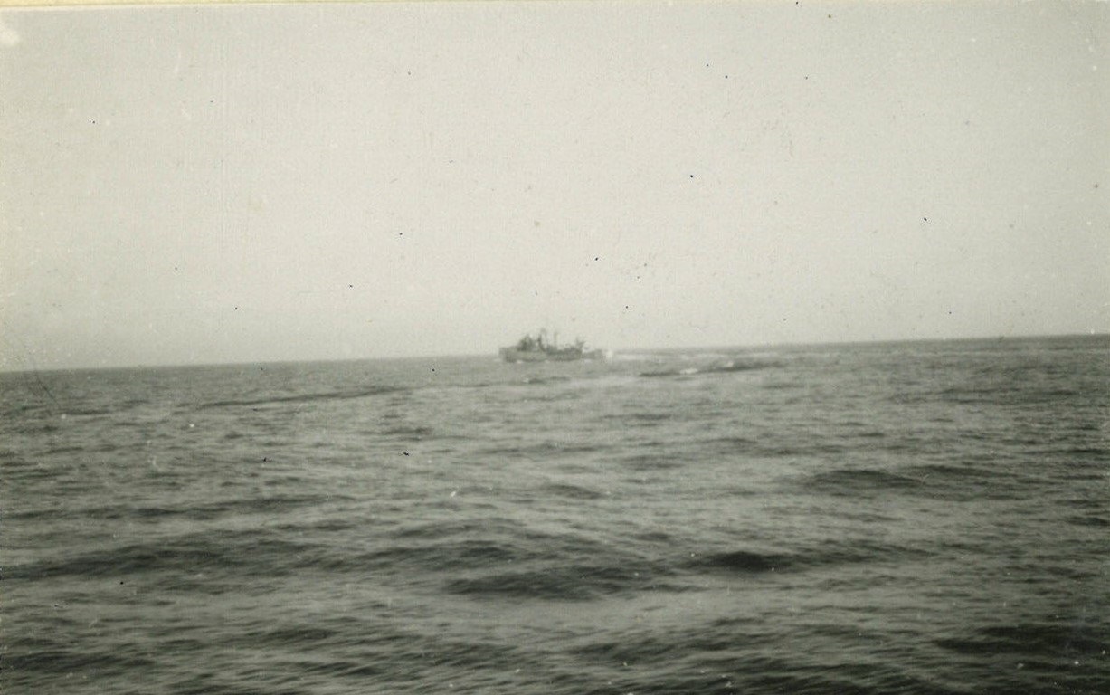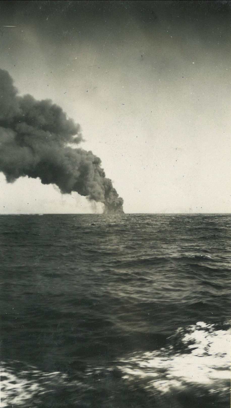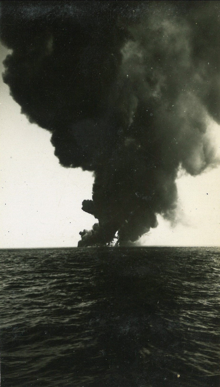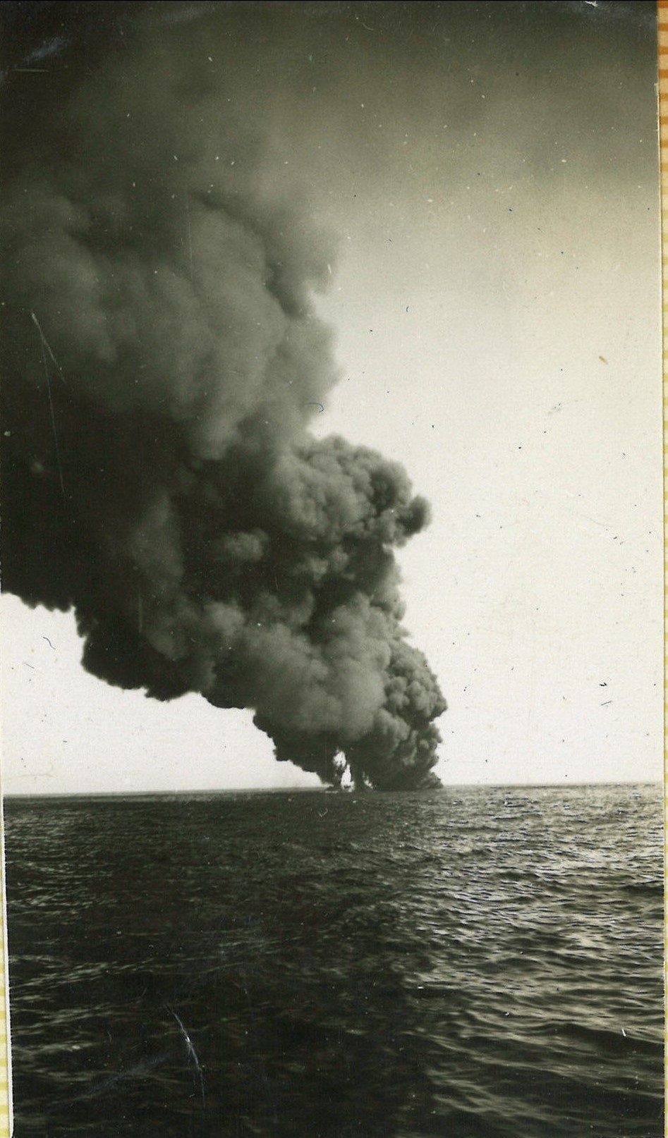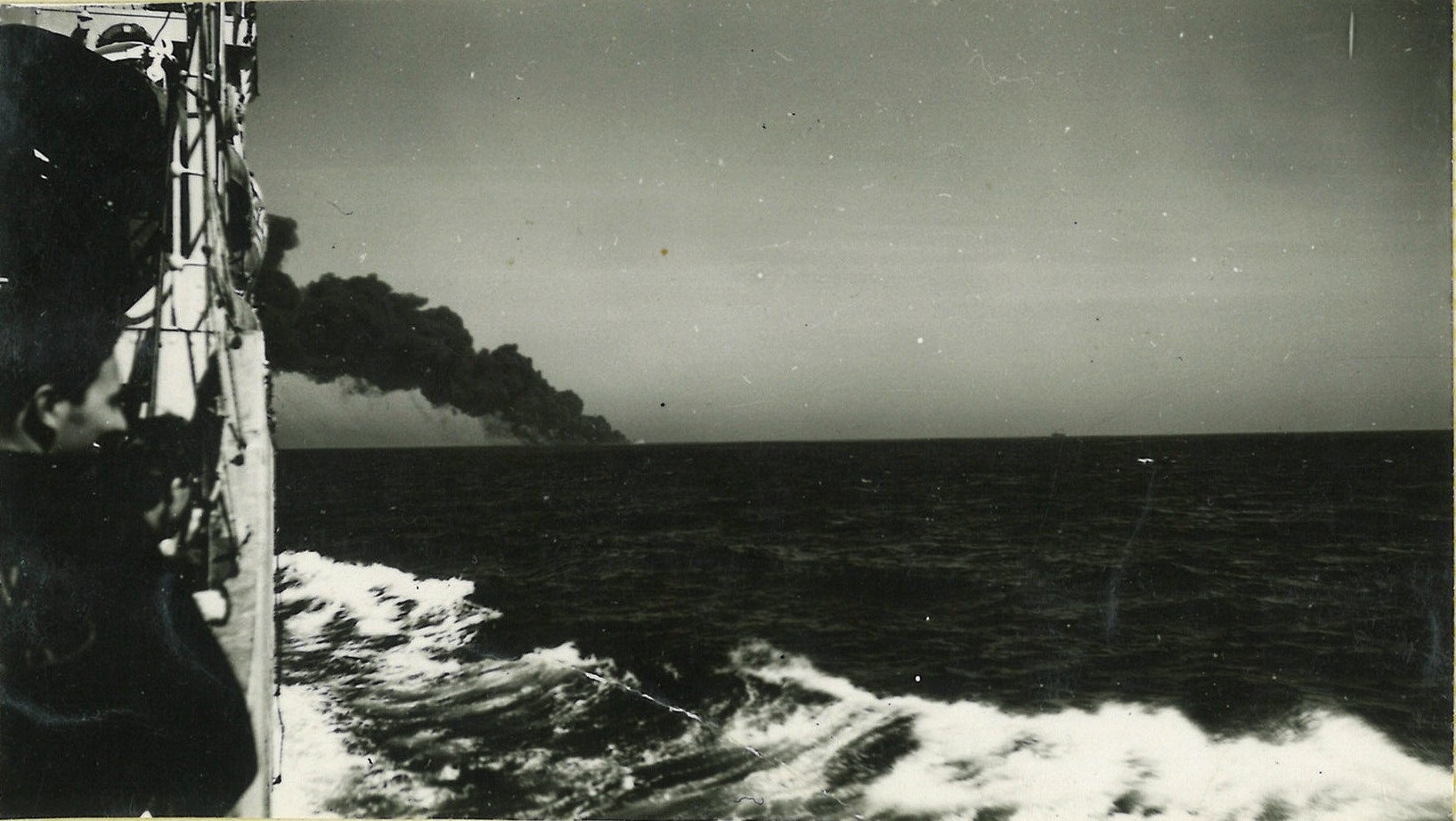 (WC81-WC84) Smoke from burring tanker (WC85) HMCS COPPER CLIFF steaming towards burning tanker Courtesy of William (Bill) Carey via his nephew Jeff Tripp