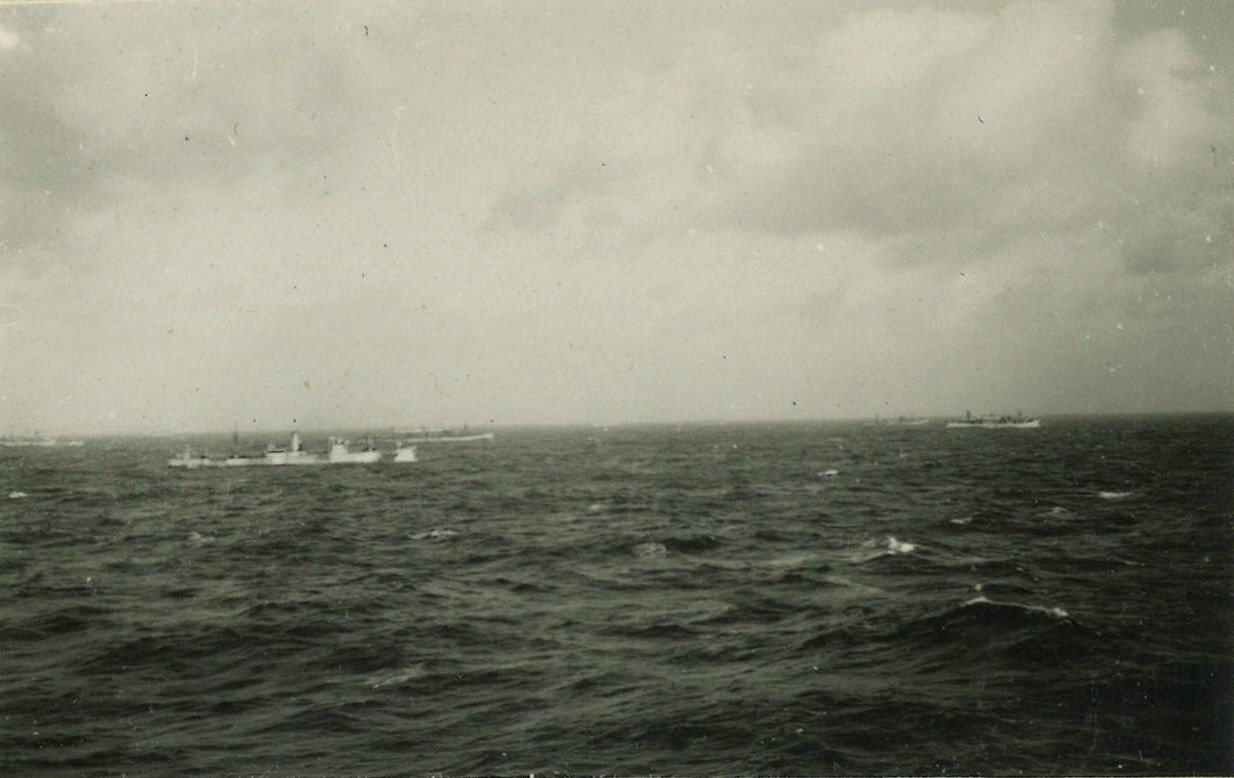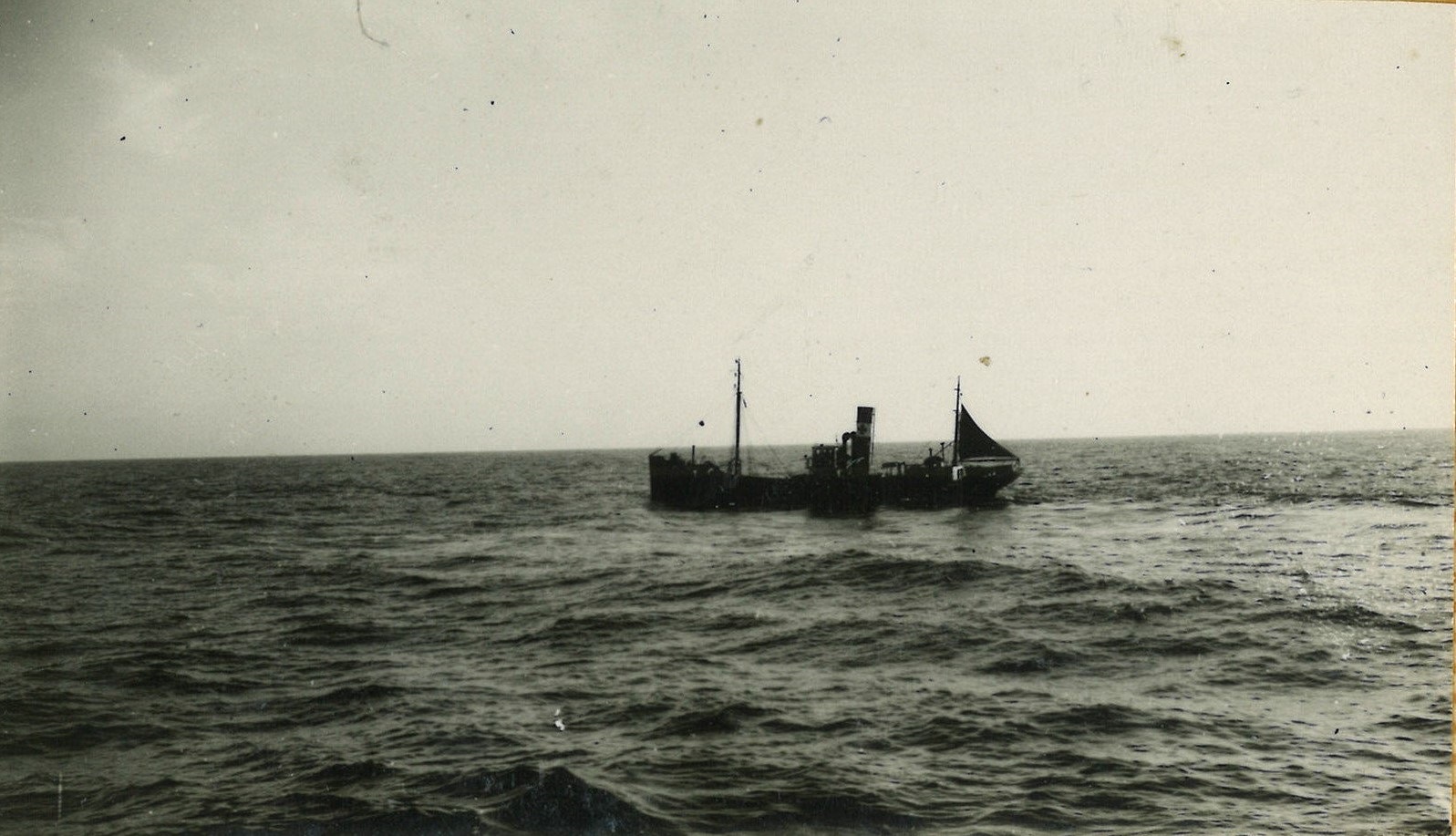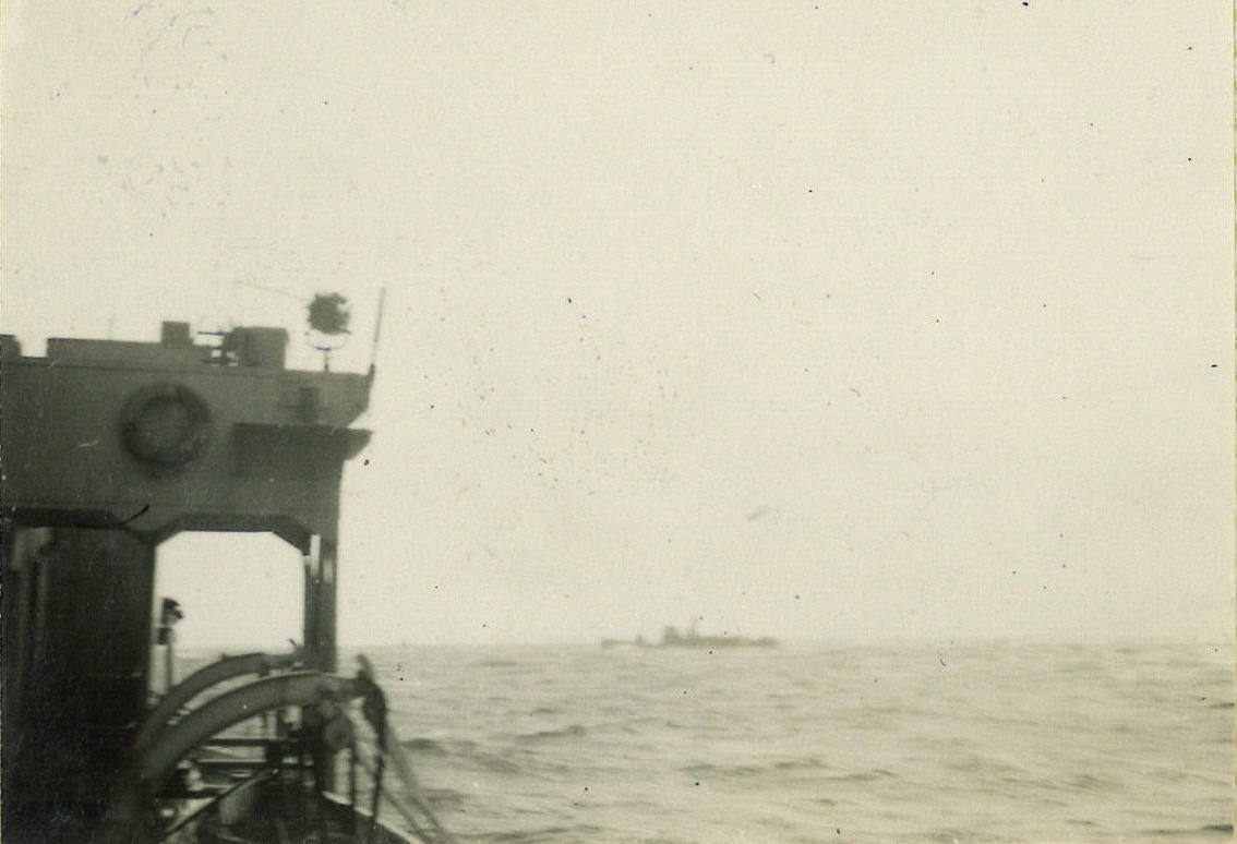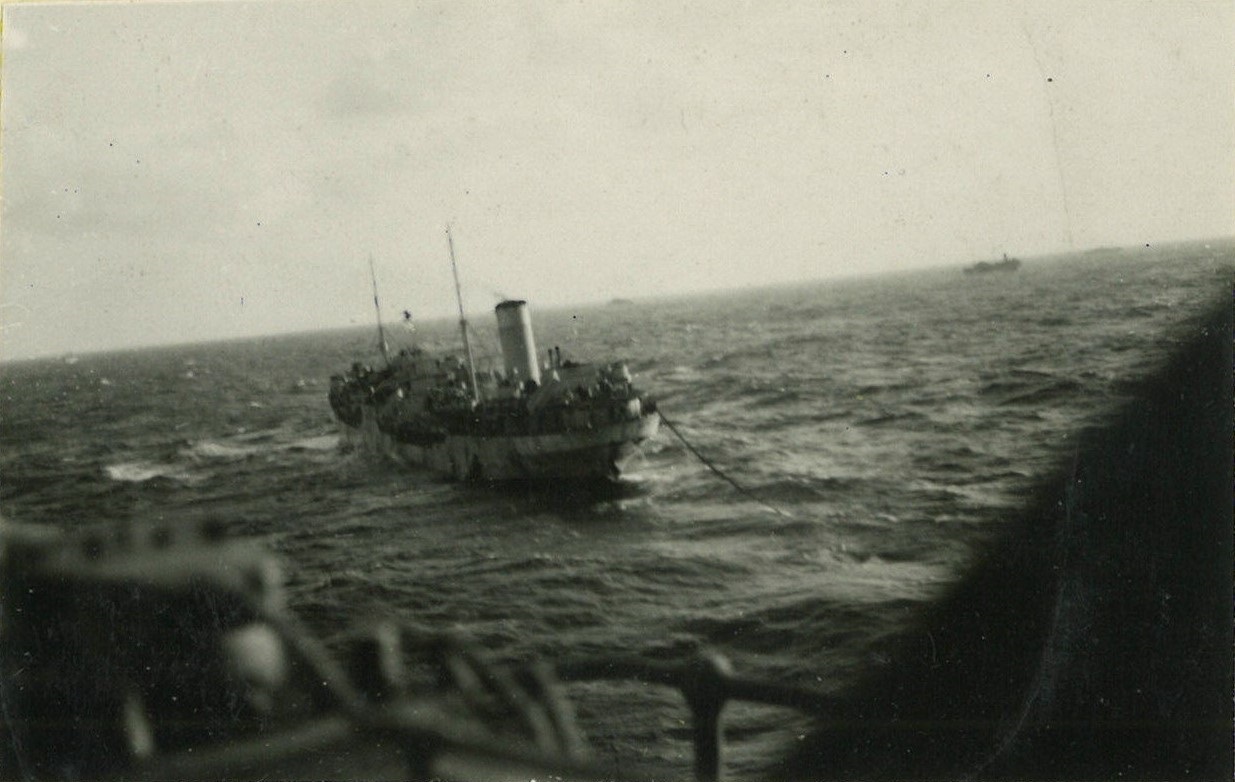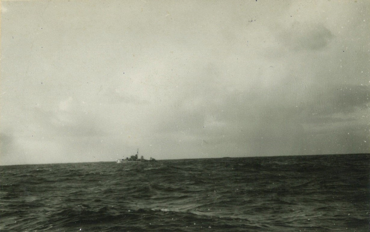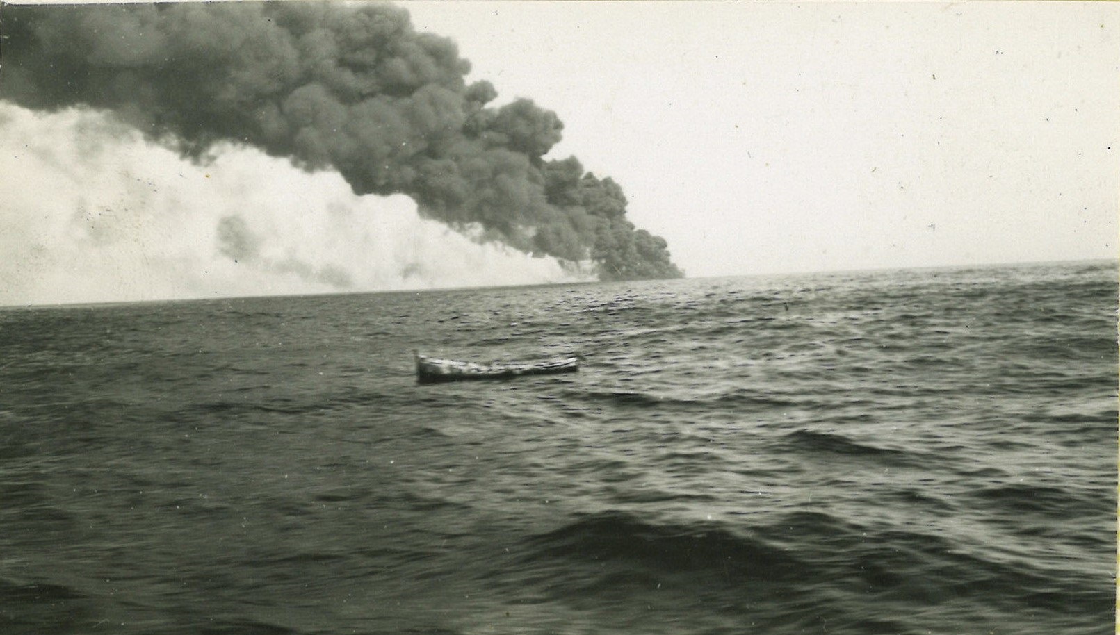 (WC81-WC84) Smoke from burring tanker (WC85) HMCS COPPER CLIFF steaming towards burning tanker Courtesy of William (Bill) Carey via his nephew Jeff Tripp