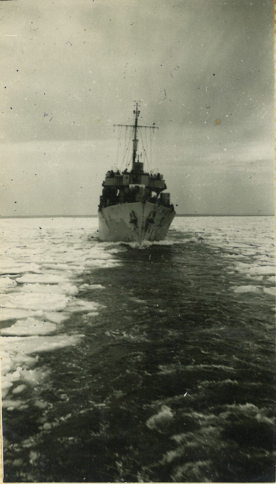 (WC11) Flower class corvette following astern of HMCS COPPER CLIFF through an ice field. Possibly HMCS SACKVILLE K181 (WC12) unknown ship (WC13-WC14) HMCS LANARK K669 (WC15) unknown ship