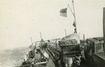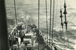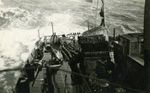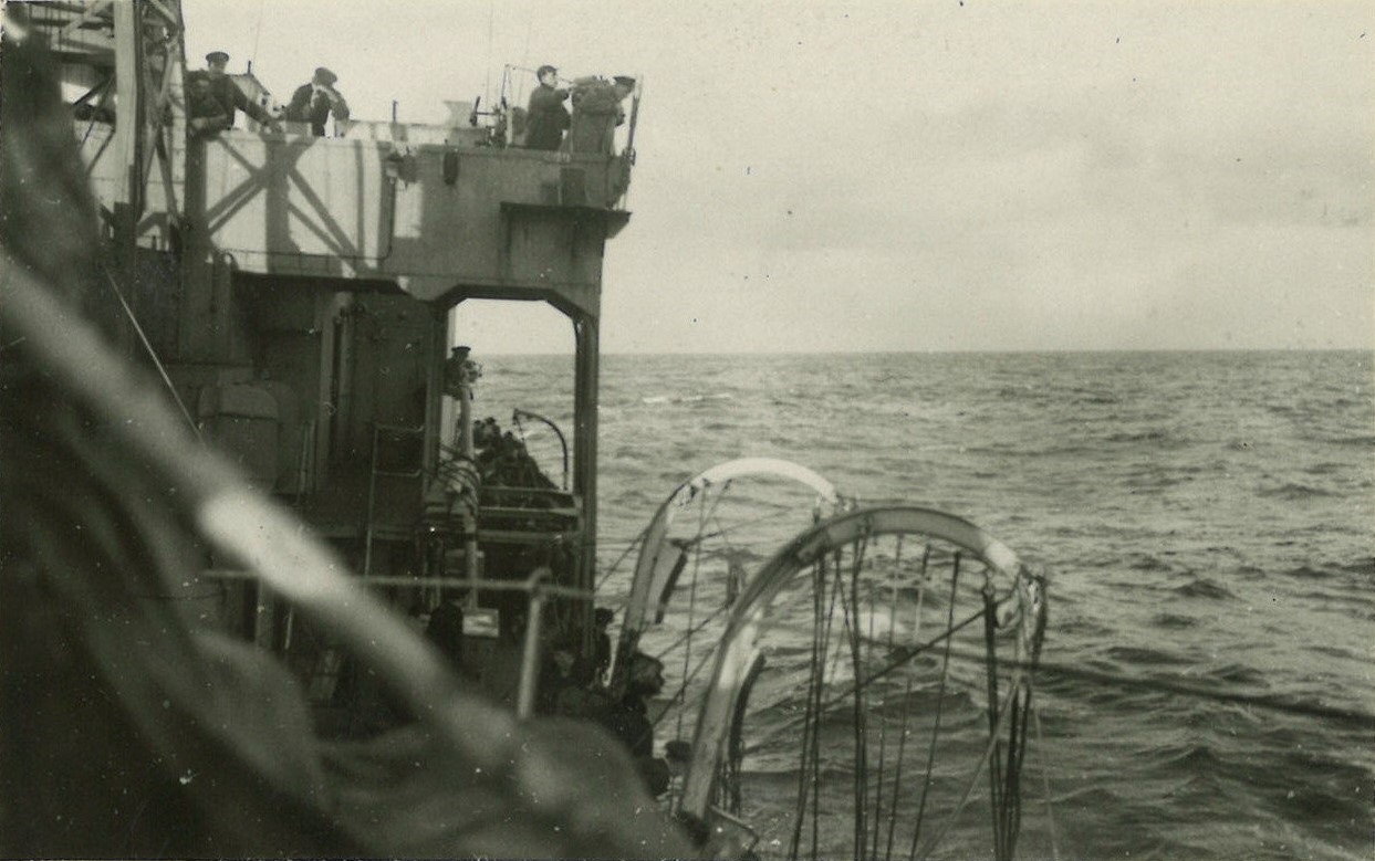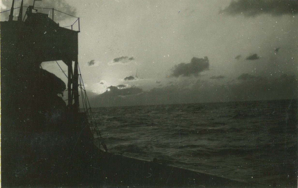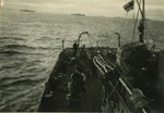 (WC26) Quarterdeck of HMCS COPPER CLIFF with convoy in background (WC27) Mast of HMCS COPPER CLIFF (WC28) Unknown shoreline (WC29) Depth charge thrower on HMCS COPPER CLIFF with the sun directly behind (WC30) Starboard bridge wing on HMCS COPPER CLIFF