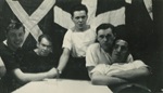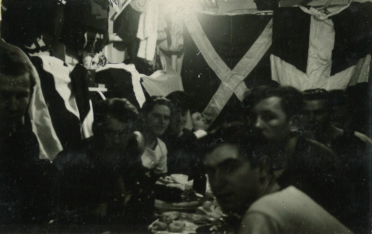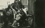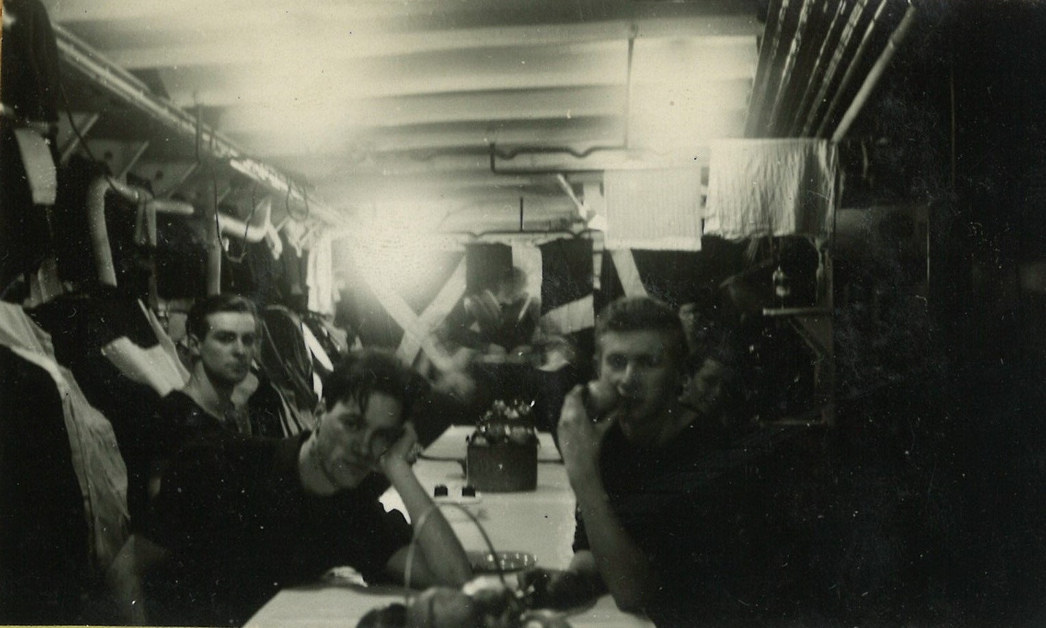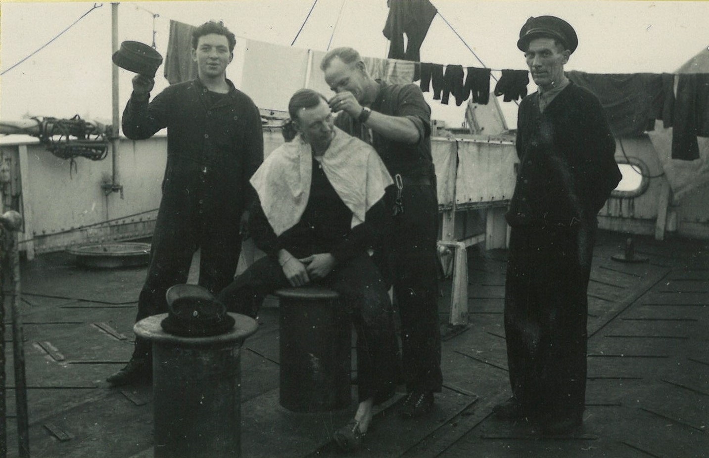(WC41-WC44) sailors in a mess deck on HMCS COPPER CLIFF. Based on the flags hung up it looks like its the communicator's mess deck. (WC41) John Wray, behind and to the left of the sailor resting his head on his hand (WC45) Time of a haircut on the quarterdeck
