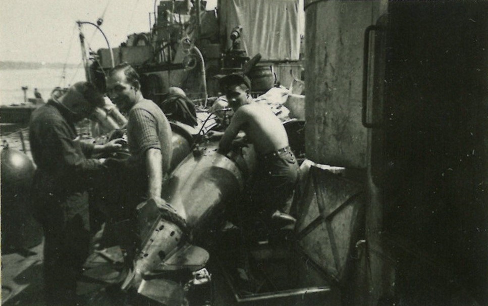 (WC51) STs and LTOs working on a torpedo. It is not known what ship as COPPER CLIFF did not have torpedo tubes (WC52) Squid launder on HMCS COPPER CLIFF (WC53) Unidentified sailor on the starboard side of HMCS COPPER CLIFF just forward of the bridge wing supports (WC54) Unidentified sailor on HMCS COPPER CLIFF paying close attention to whatever he is holding (WC55) Unidentified sailor on HMCS COPPER CLIFF