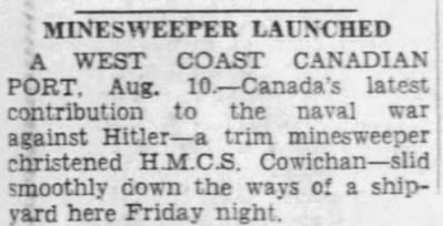 Built by North Vancouver Ship repairs Ltd., she was commissioned at Vancouver on 04 Jul 1941. She sailed from Esquimalt for Halifax on 06 Aug 1941 arriving on 10 Sep 1941. After working up in Bermuda she was initially assigned to Halifax Local Defence Force, but was transferred in Jan 1942, to Newfoundland Force and in September to WLEF. With WLEF's division into escort groups in Jun 1943, COWICHAN became a member of EG W-6. She remained with the group until Feb 1944, when she was ordered to the U.K. for invasion duties. She left Halifax on 19 Feb 1944 with CARAQUET, MALPEQUE and VEGREVILLE via the Azores for Plymouth, arriving on 13 Mar 1944. Assigned to the 31st Minesweeping Flotilla, she was present on D-Day. COWICHAN returned to Canada for refit late in 19 Feb 1945, but resumed her duties overseas in June.  Proceeding home in Sep 1945, she was paid off on 09 Oct 1945, and placed in reserve at Shelburne. Sold in 1946 to a New York buyer and converted for mercantile purposes under Greek flag, she still existed in 1956 under her original name.