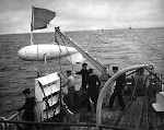 (JL03) Sailors on HMCS COWICHAN J146 prepare her minesweeping gear. Other minesweepers visible astern
