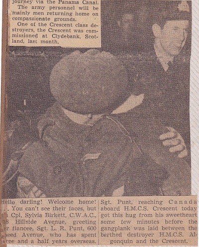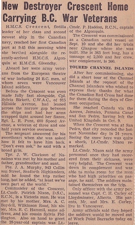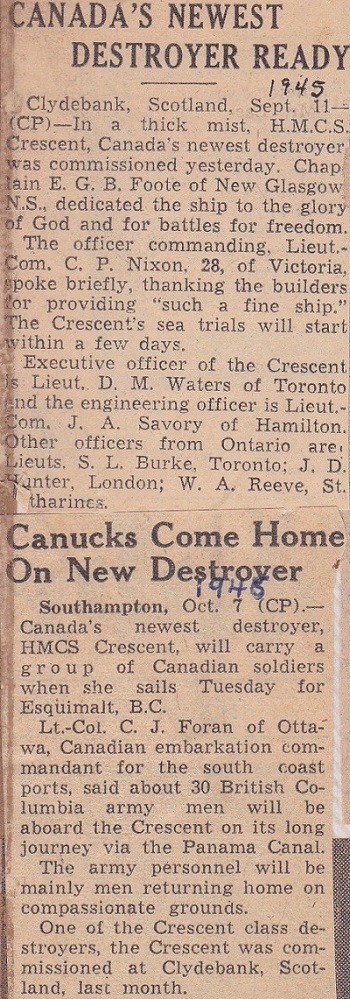 CRUSDAER on 15 Nov 1945. CRESCENT arrived at Esquimalt in Nov 1945, having made the journey via the Azores and the West