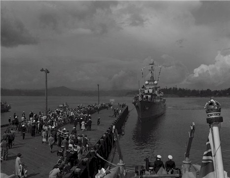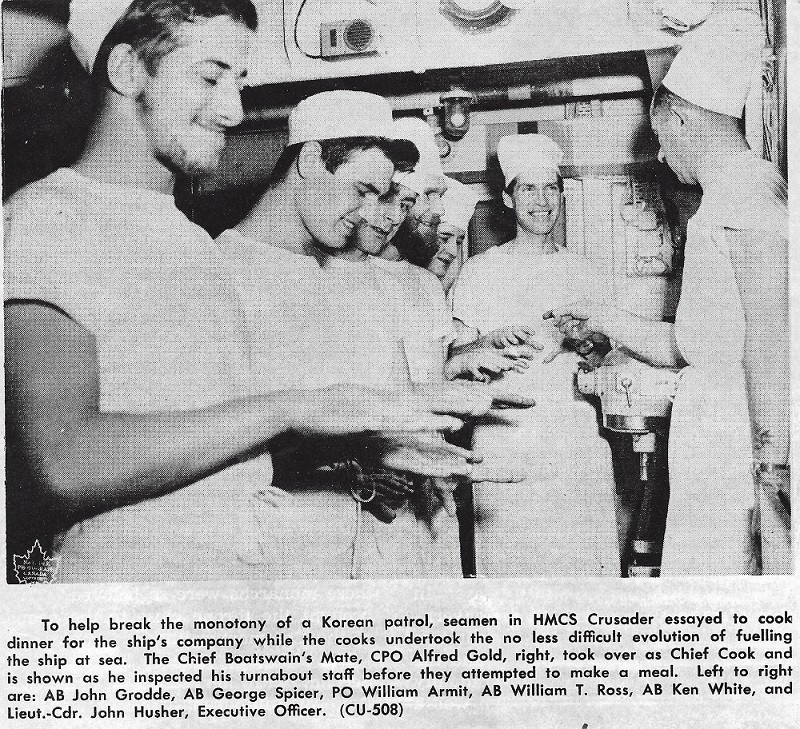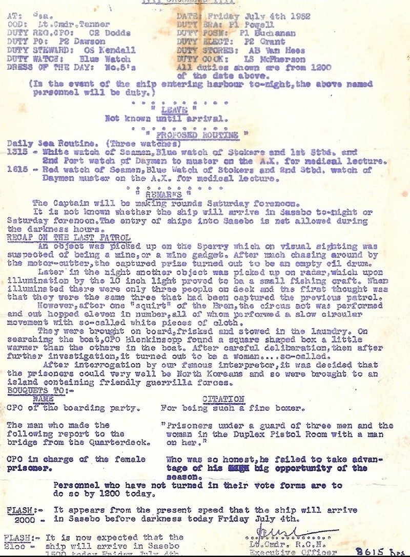 (SH15) HMCS CRUSADER conducting full power trials, May 1952 - speed 36.9 knots. "We were the fastest destroyer at that time. One CO of the American Squadron asked our CO if we could keep up, and he said Yes and then some." (SH16-S18) HMCS CRUSADER readies to depart "C" jetty, Esquimalt, for Korean theatre - 25 May 1952 (SH19) HMCS CRUSADER Daily orders for 04 Jul 1952 during Korean deployment
