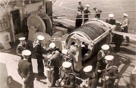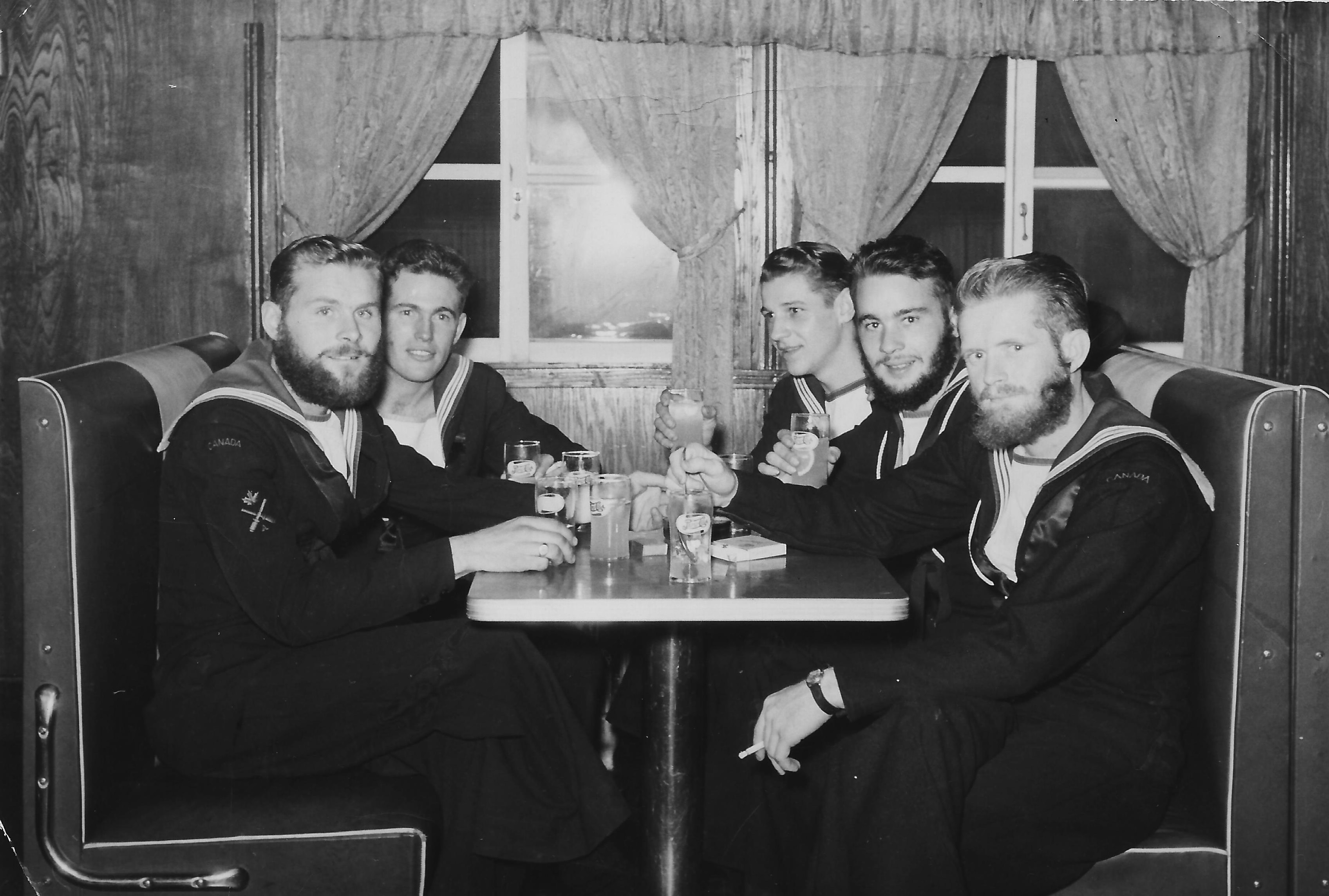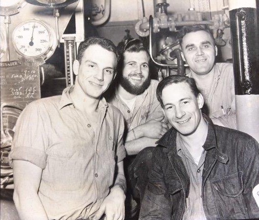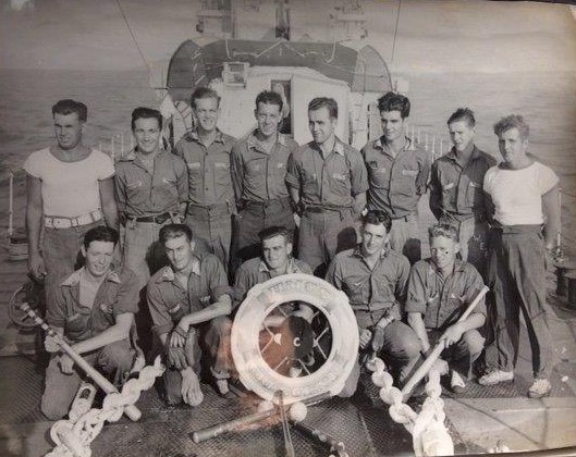 Comm Rates - HMCS CRUSADER 228 (BT102) Duffy McDougall, Bennie Stipkala, John Budris (BT103) Lyle Courtepatte (BT104) Yeoman Bill Haworth (BT105) Jim Yakaboski (BT106) Comm Officer Lt French