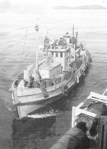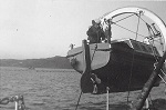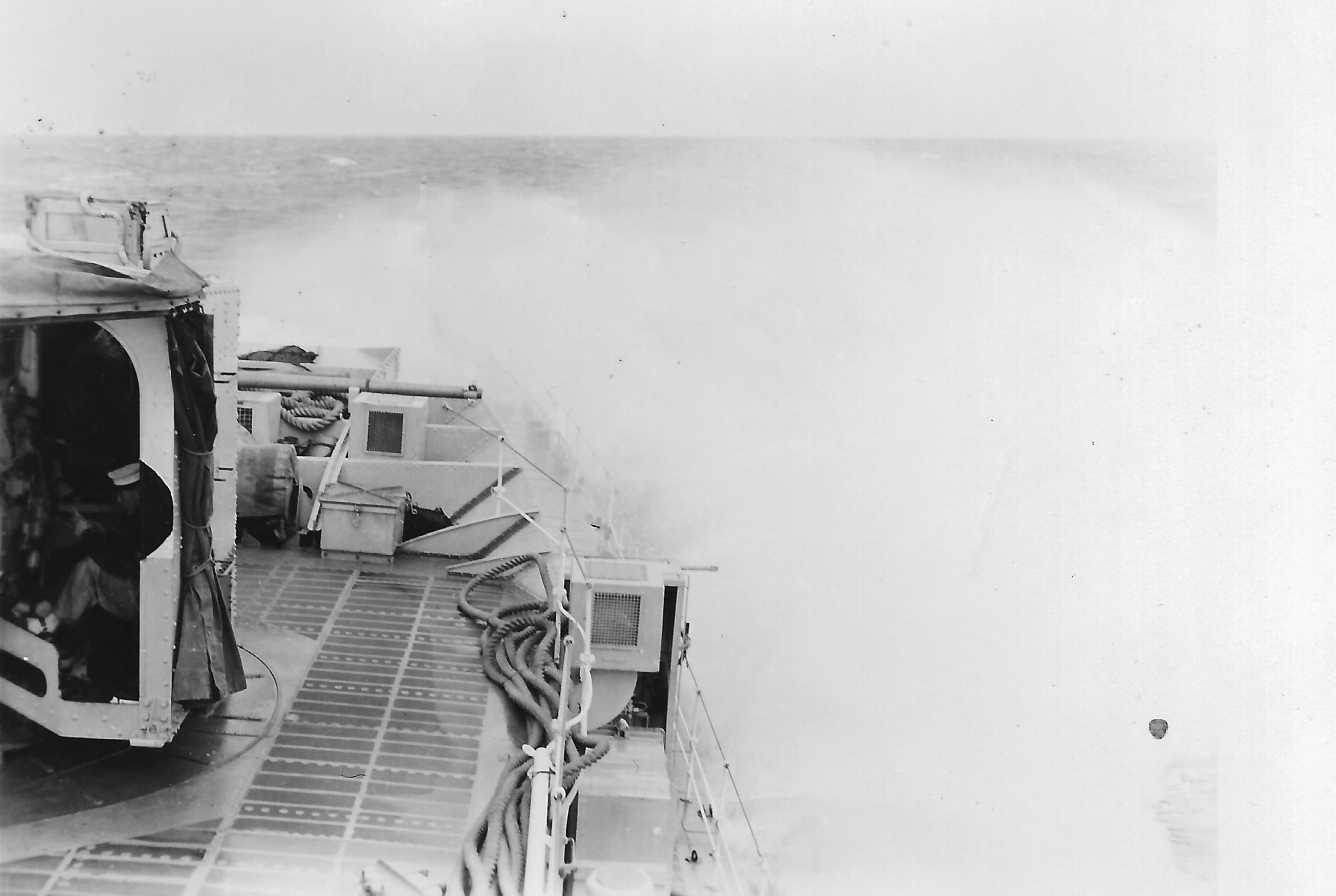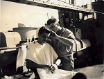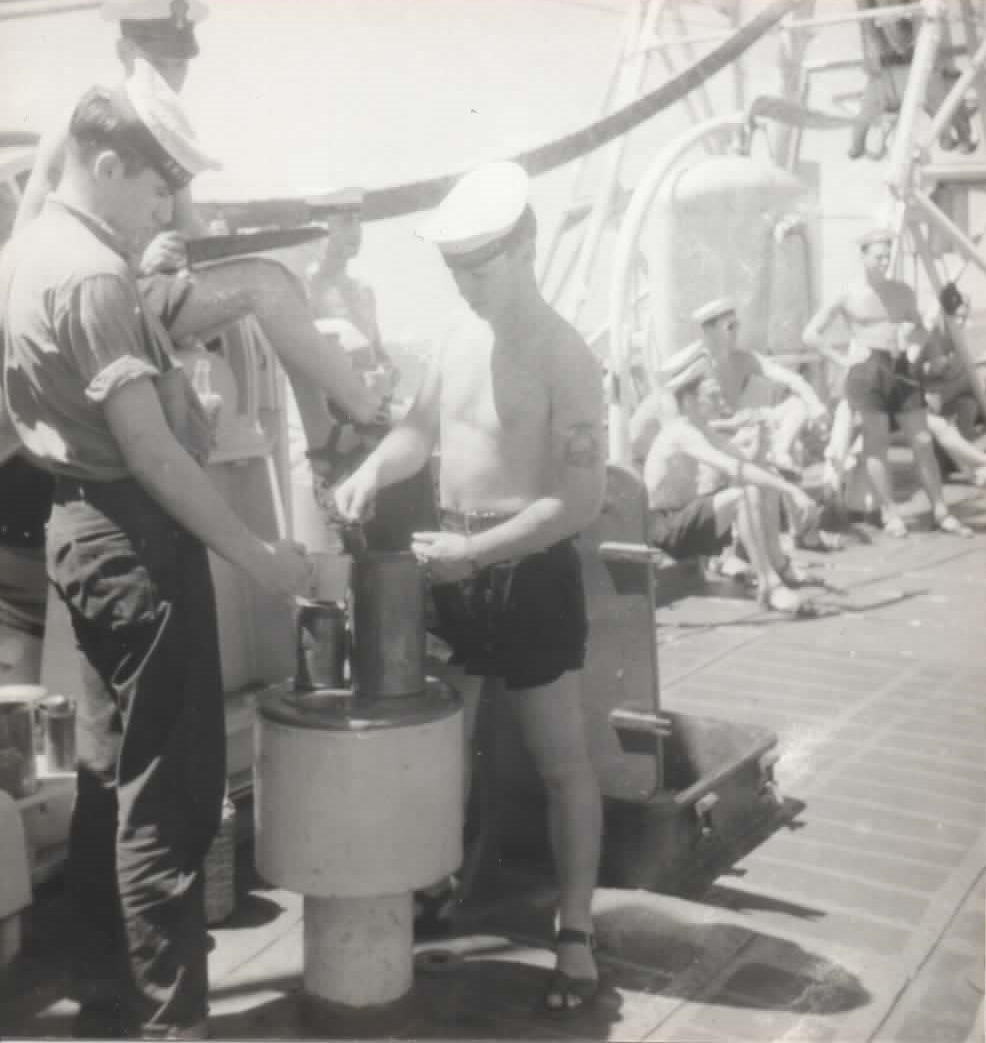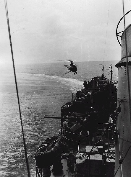 (SH45) Steve Hlasny gets a haircut from PO1 Stoker Buchanan (SH46) CRUSADER sailors - Kelbough and Wyber - 1952 (SH47) HMCS CRUSADER on night patrol off the west coast of Korean (SH48) Mail being delivered to HMCS CRUSADER while she is on patrol - 1952 (SH49) HMCS CRUSADER doing 30 knots - 1952 - Photo taken from "X" Gun Deck