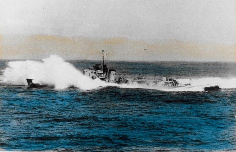 (BT124) HMCS CAYUGA 218 (BT125-BT126) Depth charge exploding astern of HMCS CRUSADER
