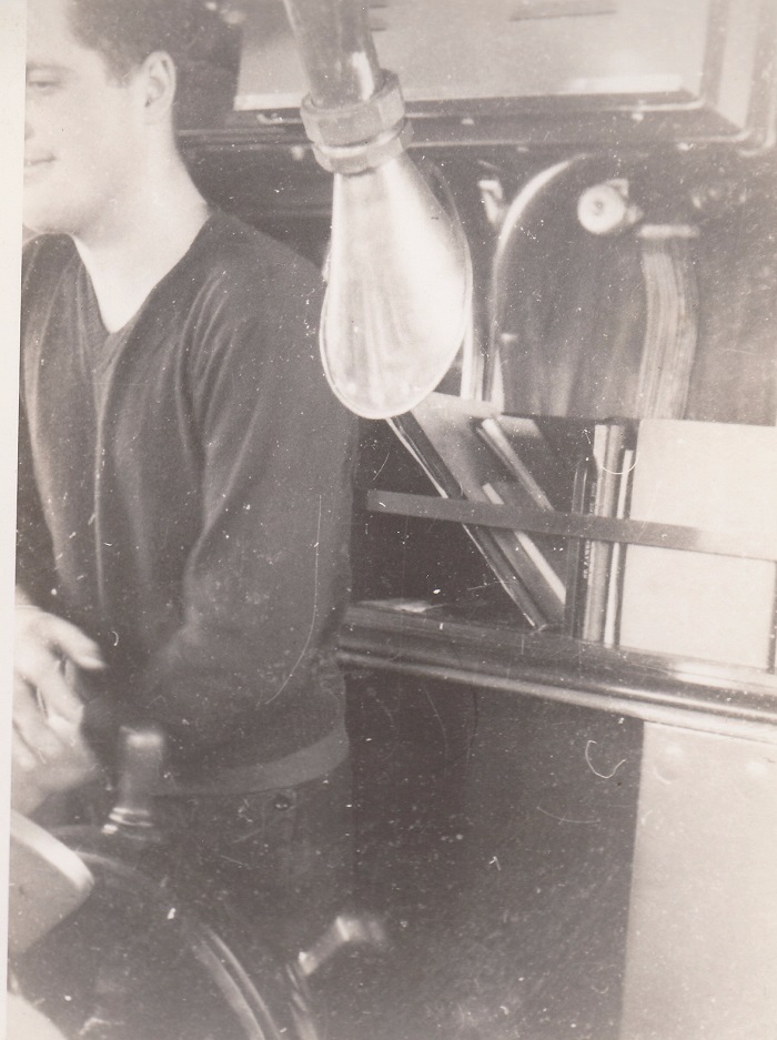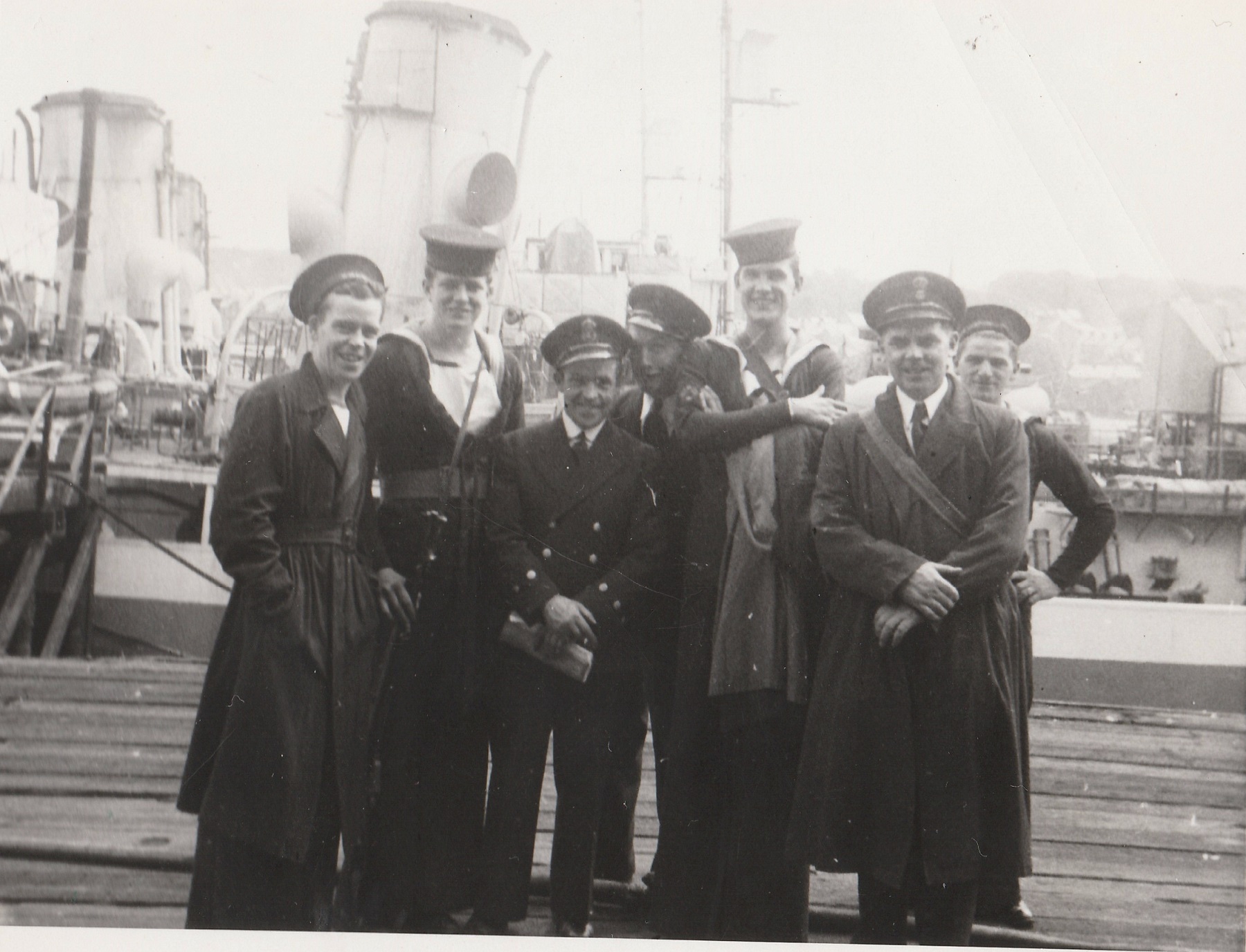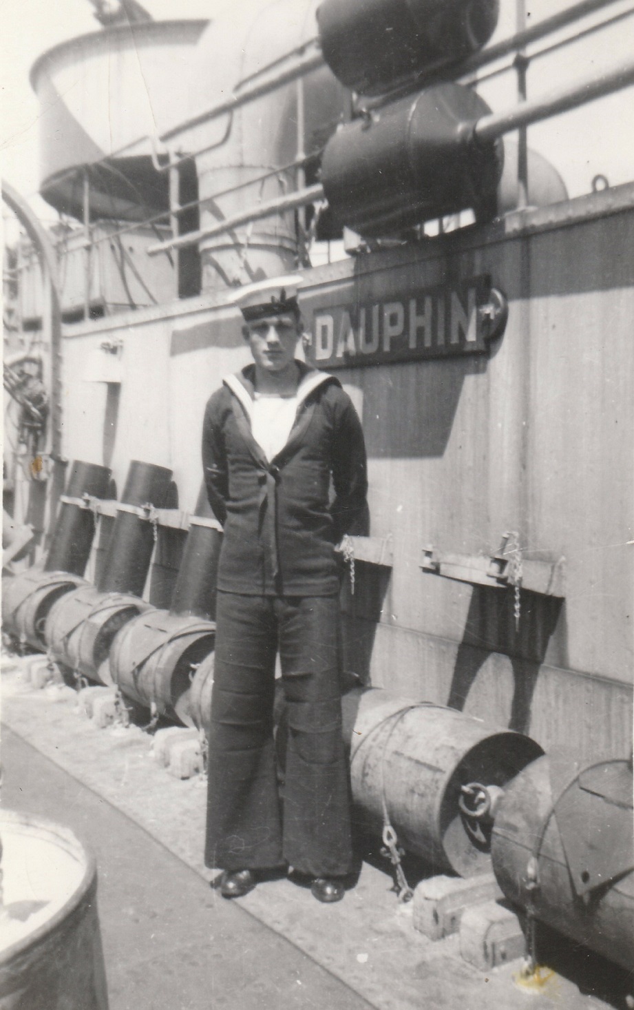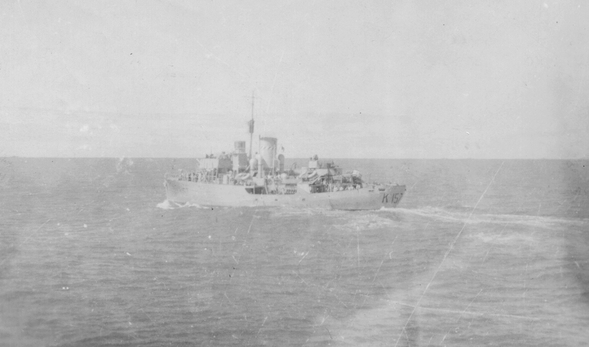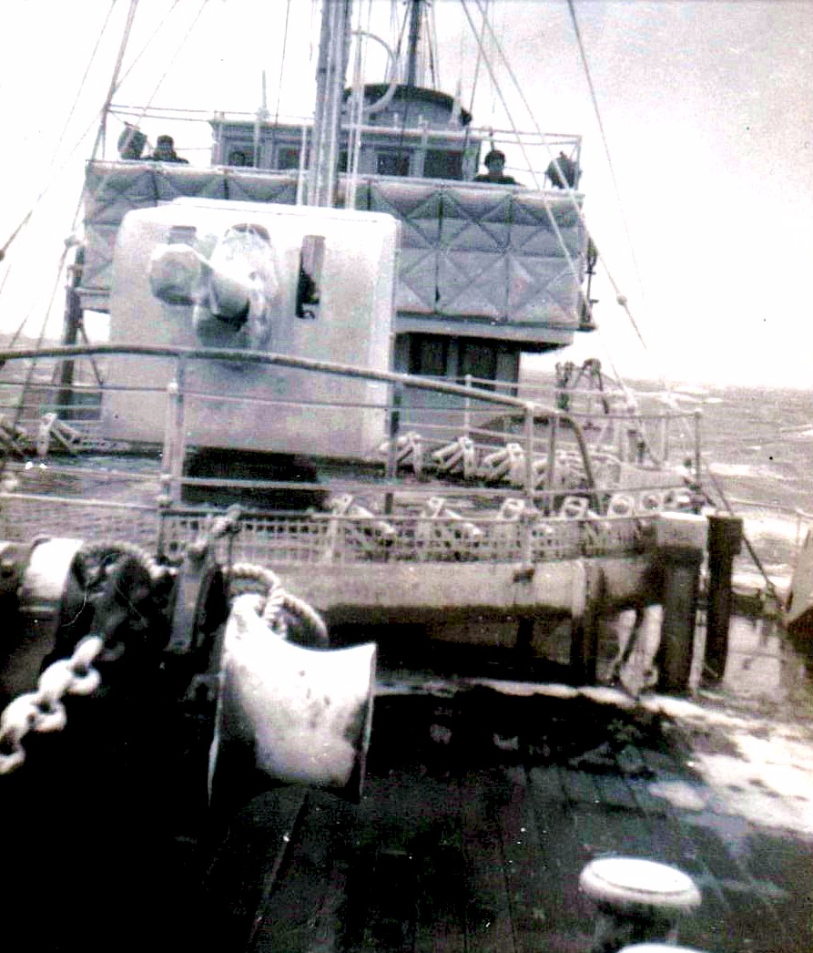 (JW20) Submarine Detector (name not known) on HMCS DAUPHIN (JW21) Ritchie as Quartermaster on HMCS DAUPHIN (WJ22) "All Smiles" on HMCS DAUPHIN (JW23) SLt Mckenzie on HMCS DAUPHIN (JW24) Corvettes alongside. The pendent number is not clear but it is possible K157 - HMCS DAUPHIN