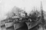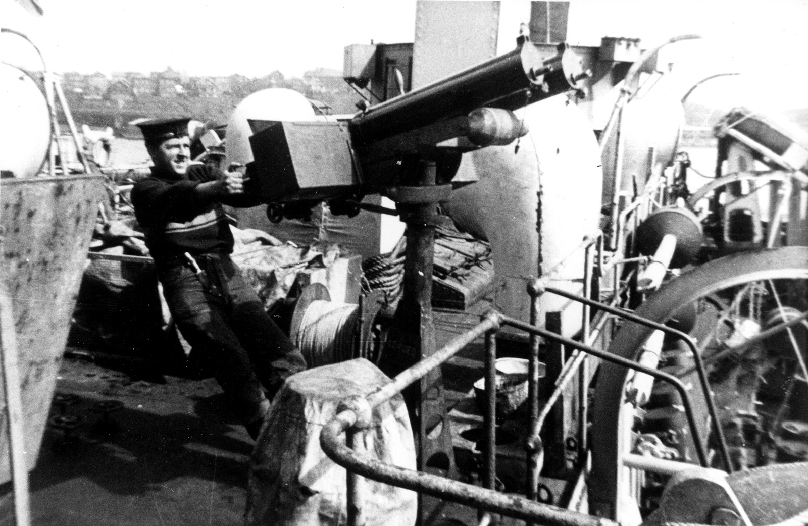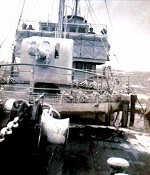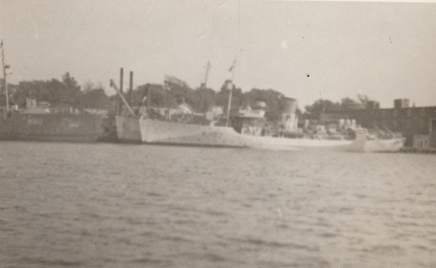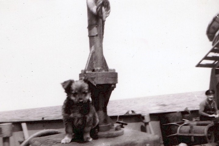 (DAU001) Lieutenant Commander RAS MacNeil and an unknown Sub Lieutenant standing next to the gunshield art on the starboard side of the gun mount on HMCS DAUPHIN K157. Both men left the Royal Canadian Mounted Police to join the Navy. Nov 1942 // © IWM # A-12845 (DAU002) Ronald Grant on the twin .5's of HMCS DAUPHIN in 1943 // Source: Flickr photo collection of Ron Bell (DAU003) "Jiggs" - HMCS DAUPHIN's mascot (DAU004) HMCS DAUPHIN 157 (2nd from the jetty), during her refit at Thompson Brothers' yard in Liverpool NS - Aug 1944 - Jan 1945 // Courtesy of Tim MacDonald (DAU005) M.V. Dundas Kent, formerly the corvette DAUPHIN, converted to a freighter by Steel and Engine Products of Liverpool, NS, burns at the wharf in Liverpool a few days before ready for sea. // Click here to read the back of the photo // From the collection of Hector Dunlop // Courtesy of Jane Dunlop Stevenson, Liverpool, NS