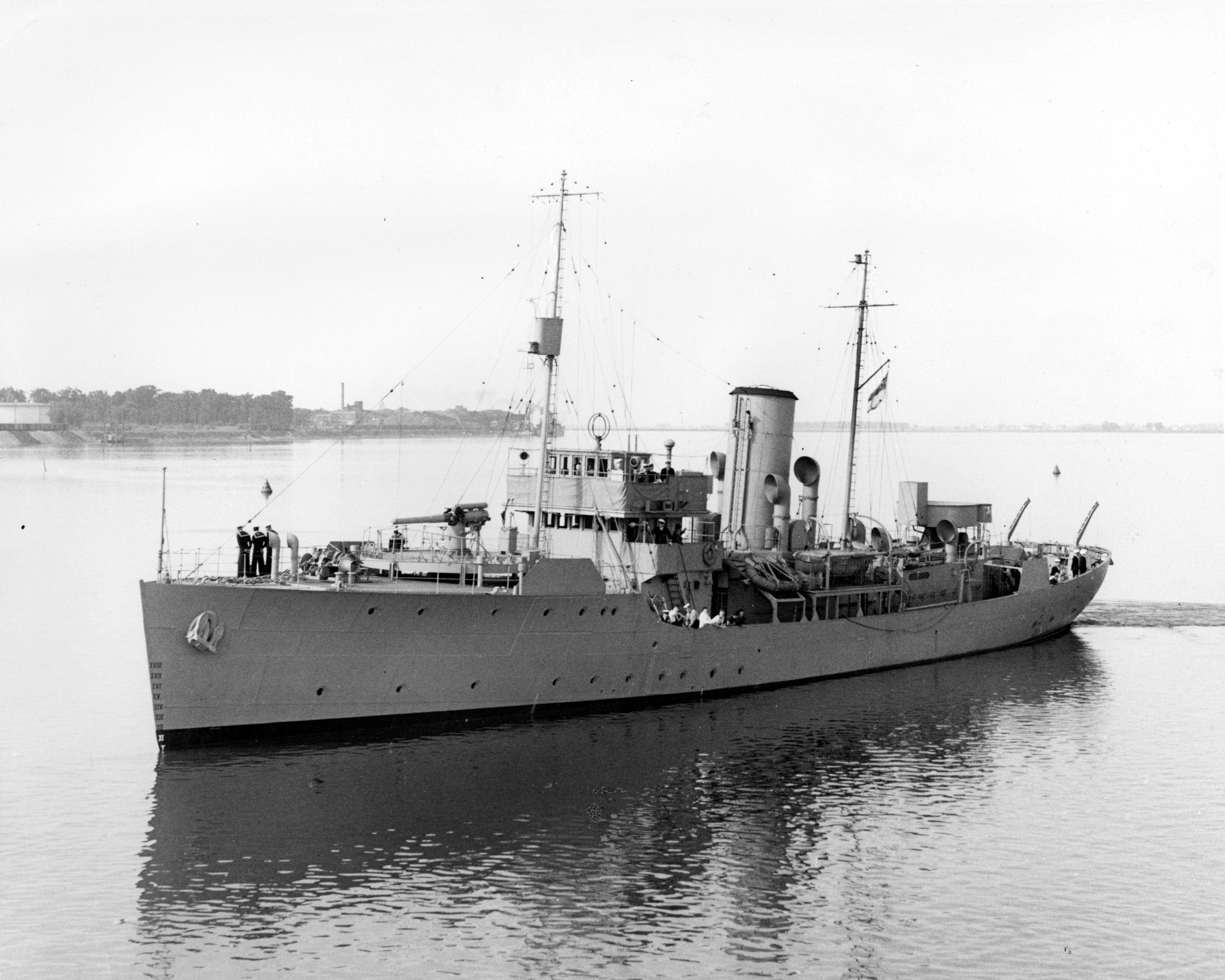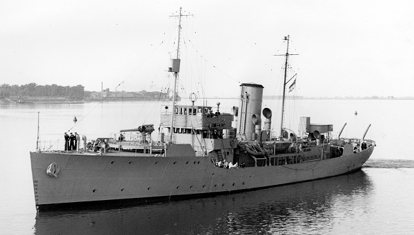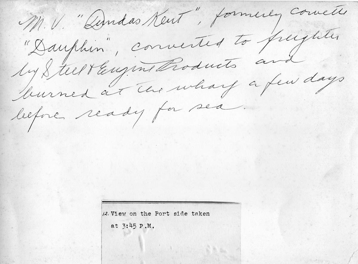 She was paid off at Sorel on 20 Jun 1945, and sold for conversion to a merchant ship. DAUPHIN was converted to a merchant ship at the yards of Steel and Engine Products, Liverpool, NS. Named Dundas Kent, just as she neared completion she caught fire and burned at the pier. Repaired, she entered service in 1949 as the Honduran Cortes. She became the Ecuadorian flagged vessel San Antonio in 1955 and was registered under an Ecuadorean flag until 1988, her name was deleted from the ships register in 1992.
