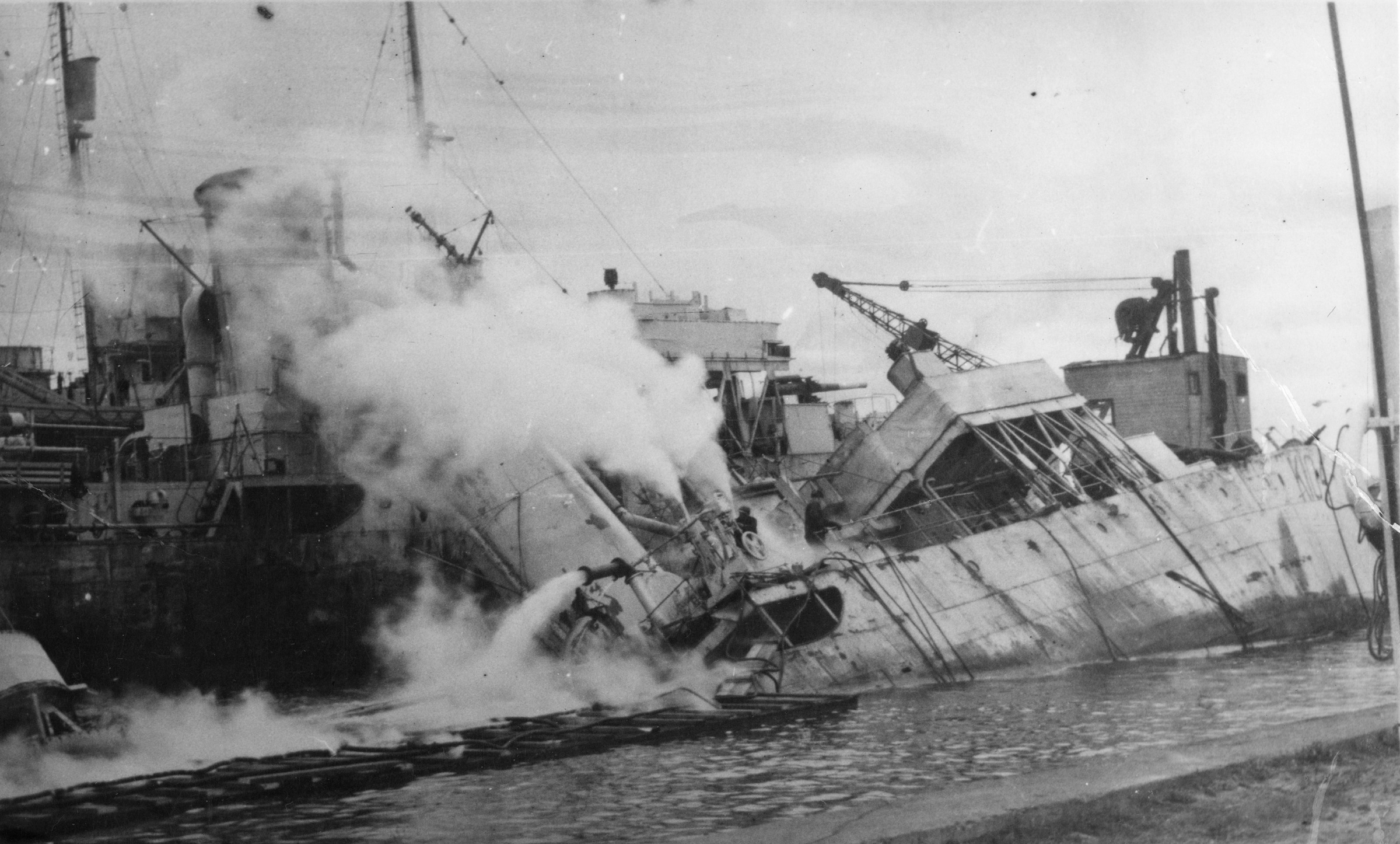 (DSN005 - DSN007) HMCS DAWSON K104 when she foundered at the breaker's yard, United Steel and Metal, at Hamilton, Ontario on 23 Mar 1946 // Source: flickr collection of Ron Bell