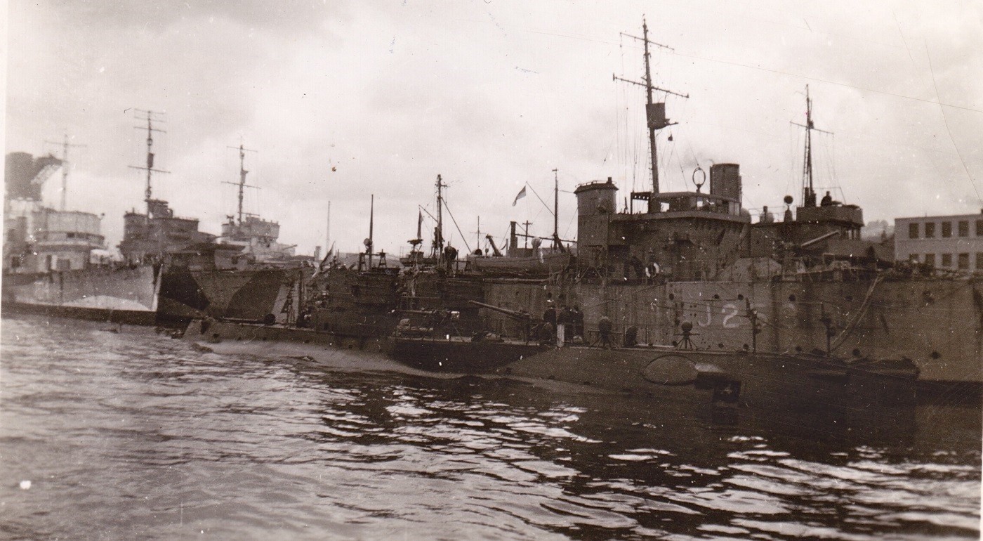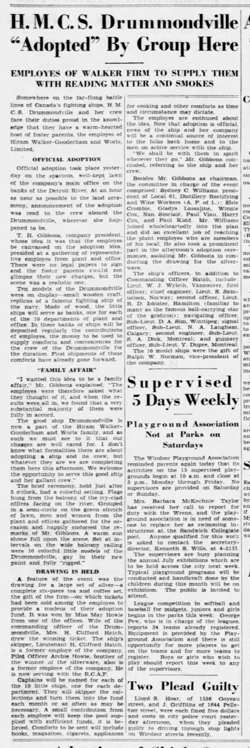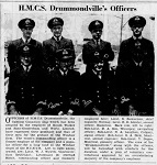 (DMV001) Ships in HMC Dockyard, Halifax - Outboard destroyer, HMCS ANNAPOLIS I04, outboard minesweeper, HMCS DRUMMONDVILLE J253 // From the collection of Albert William Abercrombie // Courtesy of Bill Abercrombie (DMV002) HMCS DRUMMONDVILLE Adopted by Group Here // The Windsor Star 20 Jul 1943 // Courtesy of Anne Gafiuk (DMV003) Offices of HMCS DRUMMONDVILLE // Lt W.J. Wyleth, Vancouver, First Lieutenant; Lt H. Clifford Hatch, CO; Lt S. Samuelsen, Chief Engineer, Norway; Lt R.D. Isbister, Second Officeer, Hamilton; SLt D.A. Sim, Winnipeg, Navigating Officer; SLt N.A. Laughan, Calgary, Signal Officer; SLt S.A. Dick, Montreal, Second Engineer; SLt Y. Dupre, Montreal, Gunnery Officer // The Windsor Star 26 Jul 1943 // Courtesy of Anne Gafiuk