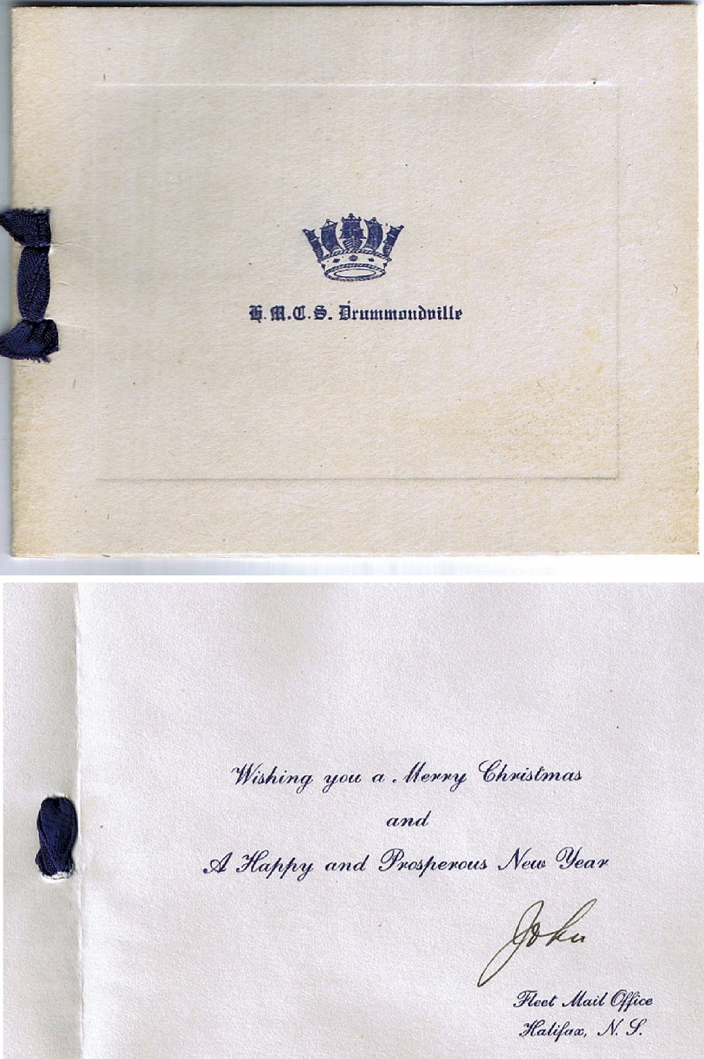(JM26) HMCS DRUMMONDVILLE J253 - RCN photo (JM27) HMCS DRUMMONDVILLE J253, St. John's, Newfoundland - Mar 1942 (JM28) HMCS DRUMMONDVILLE Christmas Card From the collection of John Murphy, ERA 4c, RCNVR Courtesy of Thomas Murphy