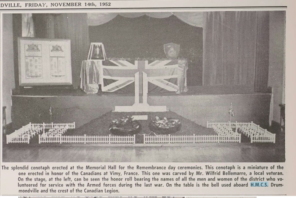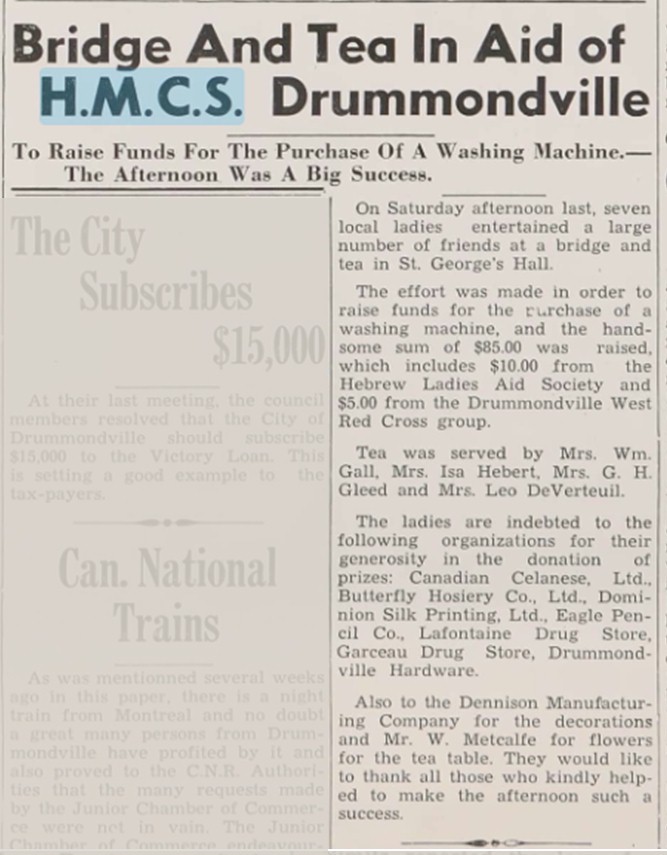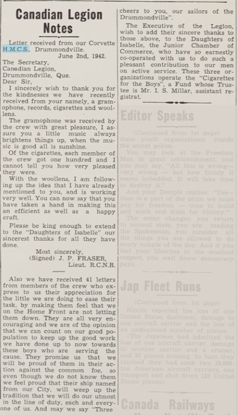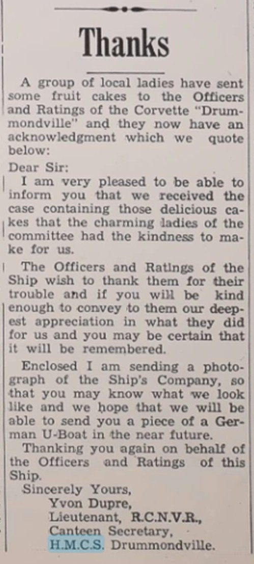 (DMV004) Letters of thanks from HMCS DRUMMONDVILLE for a gramophone, records, cigarettes and woollens // The Spokesman Journal 12 Jun 1942 (DMV005) Bridge and Tea in Aid of HMCS DRUMMONDVILLE // The Spokesman Journal 29 Sep 1943 (DMV006) Letter of Thanks from HMCS DRUMMONDVILLE for fruitcakes sent to the ship // The Spokesman Journal 15 Oct 1943 (DMV007) Remembrance Day cenotaph that included the ship's bell of HMCS DRUMMONDVILLE // The Spokesman Journal 14 Nov 1952 (DMV008) A brief history of HMCS DRUMMONDVILLE by Jean Thibault // Click here to read the translation by Ted Whitehouse Research by Stéphanie Courchesne for the Société d'histoire de Drummond Courtesy of Ted Whitehouse