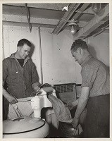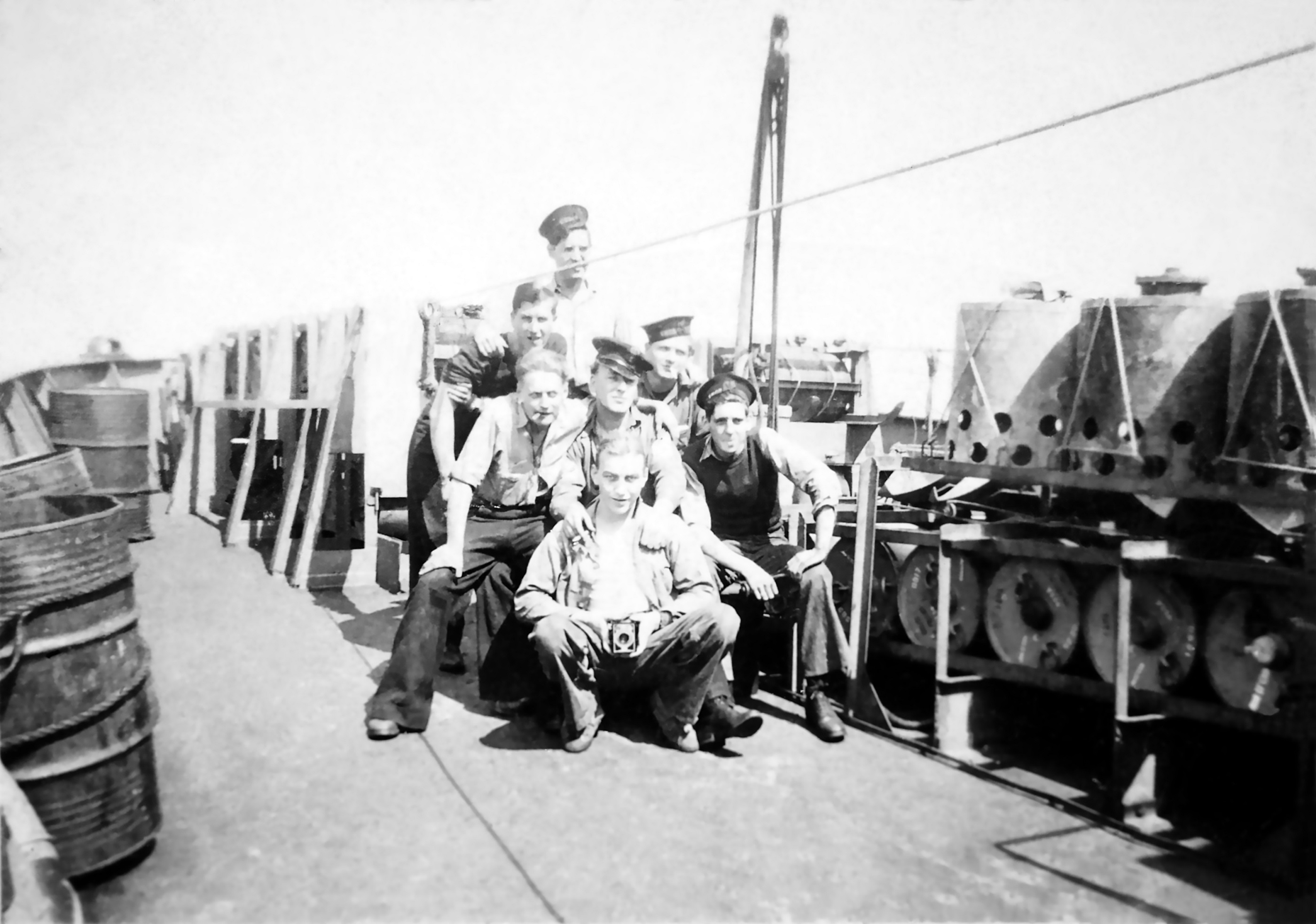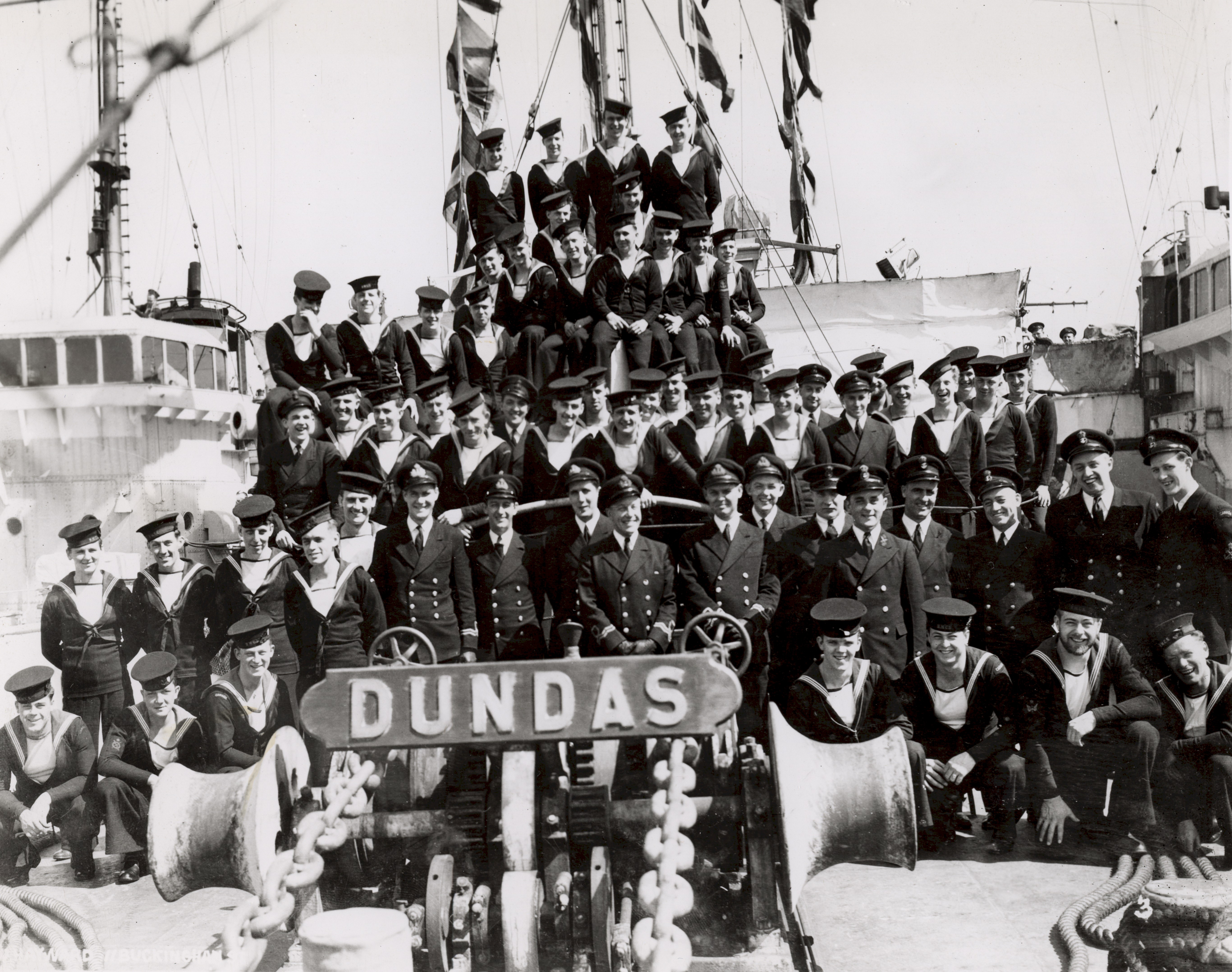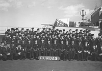 (DMA01) HMCS DUNDAS K229 ship's company photo circa May-Jun 1943 (DMA0202) HMCS DUNDAS K229 ship's company photo post 1943 refit (DM03) Storesman on HMCS DUNDAS K229 receiving an iron from the ship's CO (DMA04) Dhobey (laundry) day on HMCS DUNDAS K229 Note: The 2 crew photo are also posted on the ship's company photo page for HMCS DUNDAS K229