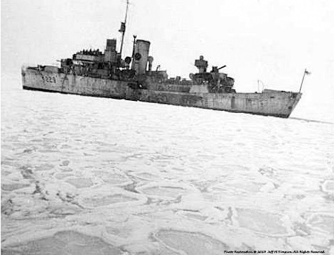 (WD53) HMCS DUNDAS K229 ice up - port side aft looking forward (WD54) Iced Up depth charge thrower on HMCS DUNDAS K229 (WD55) Sailors chipping ice off HMCS DUNDAS K229 (WD56) HMCS DUNDAS K229 iced up - starboard side looking after from the bridge wing (WD57) HMCS DUNDAS K229 - iced up - port side ladder up to the gun deck and fo'c's'le