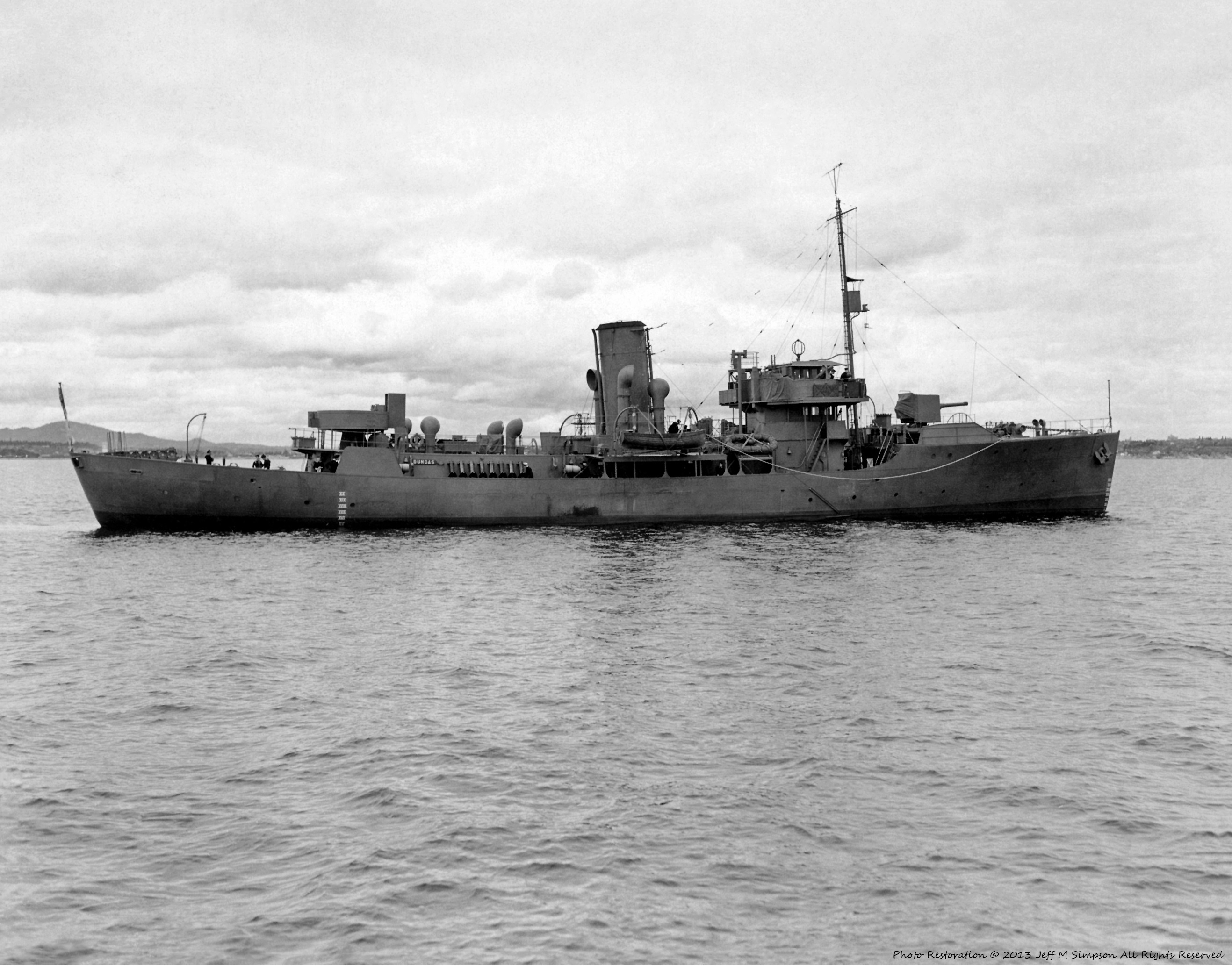 She served with EG W-7 from Jun 1943, with W-5 from Sep 1943, and with W-4 from Apr 1944. In the course of a major refit at Montreal from 13 Jun to 19 Nov 1943, DUNDAS acquired her extended fo'c's'le. She commenced another long refit early in Jan 1945, at Liverpool, N.S., resuming service in Apr 1945. Paid off on 17 Jul 1945 at Sorel, she was sold later that year and broken up in 1946 at Hamilton, Ont.