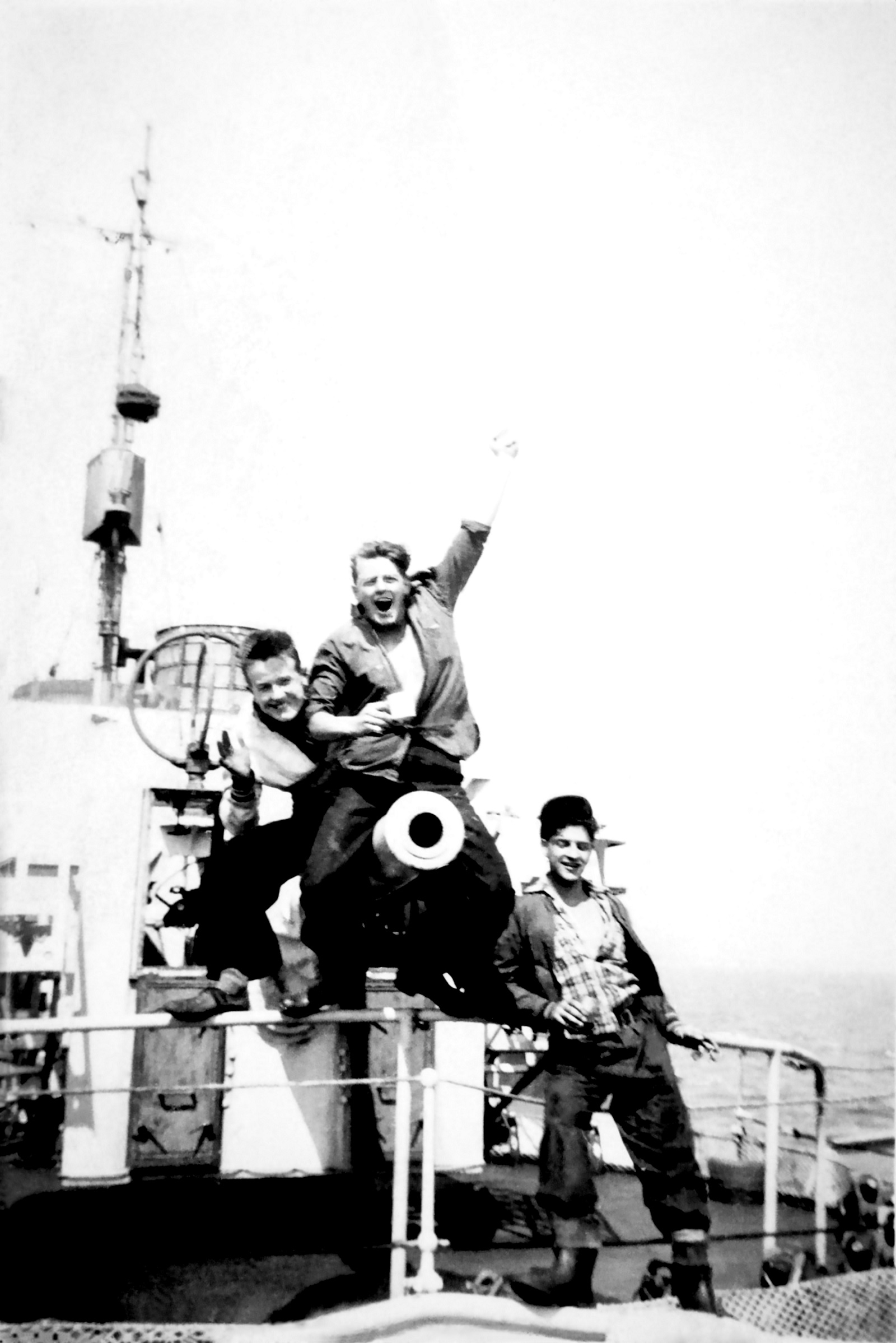 (JS18) HMCS DUNDAS K229 training cruise in the Caribbean, circa 1945 - John Frederick Simpson, (2nd row, 1st on right) (JS19-JS20) John Frederick Simpson on the gun of HMCS DUNDAS