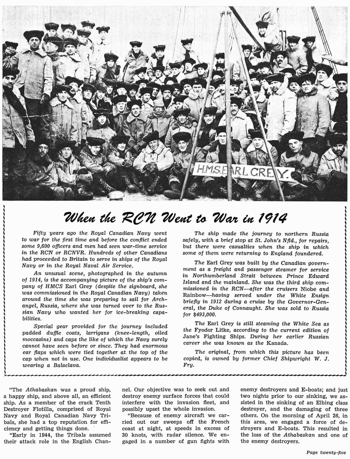 During her voyage from Halifax, NS, to Archangel, Russia in 1914, HMCS Earl Grey has a crew of 121 - more than twice the usual crew