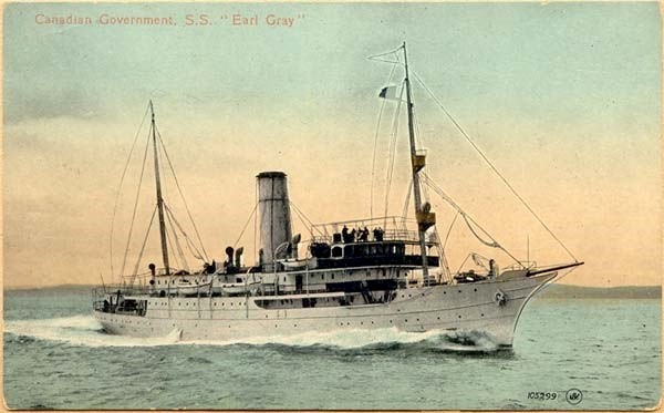 The Earl Grey was launched in June 1909 from the Barrow-in-Furness yard of Vickers Sons and Maxim. It had an overall length of 279 feet, was 46 feet wide and drew 18 feet of water. The steel hull was reinforced for ice. Accommodations included a first class dining saloon forward on the promenade deck with seating for 60 and first class staterooms amidships. The several staterooms included berths for one, two, or three persons. The aft section of the upper deck held the mail room and storage. The freight was found on the main deck as were the accommodations for second class passengers (sofa seats with folding backs which could form 20 beds), engineers, firemen and trimmers.