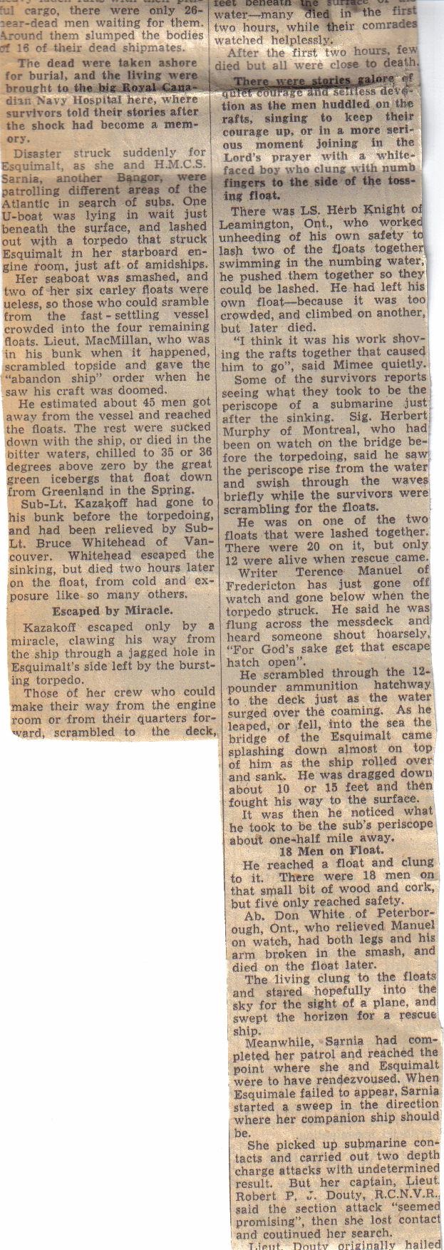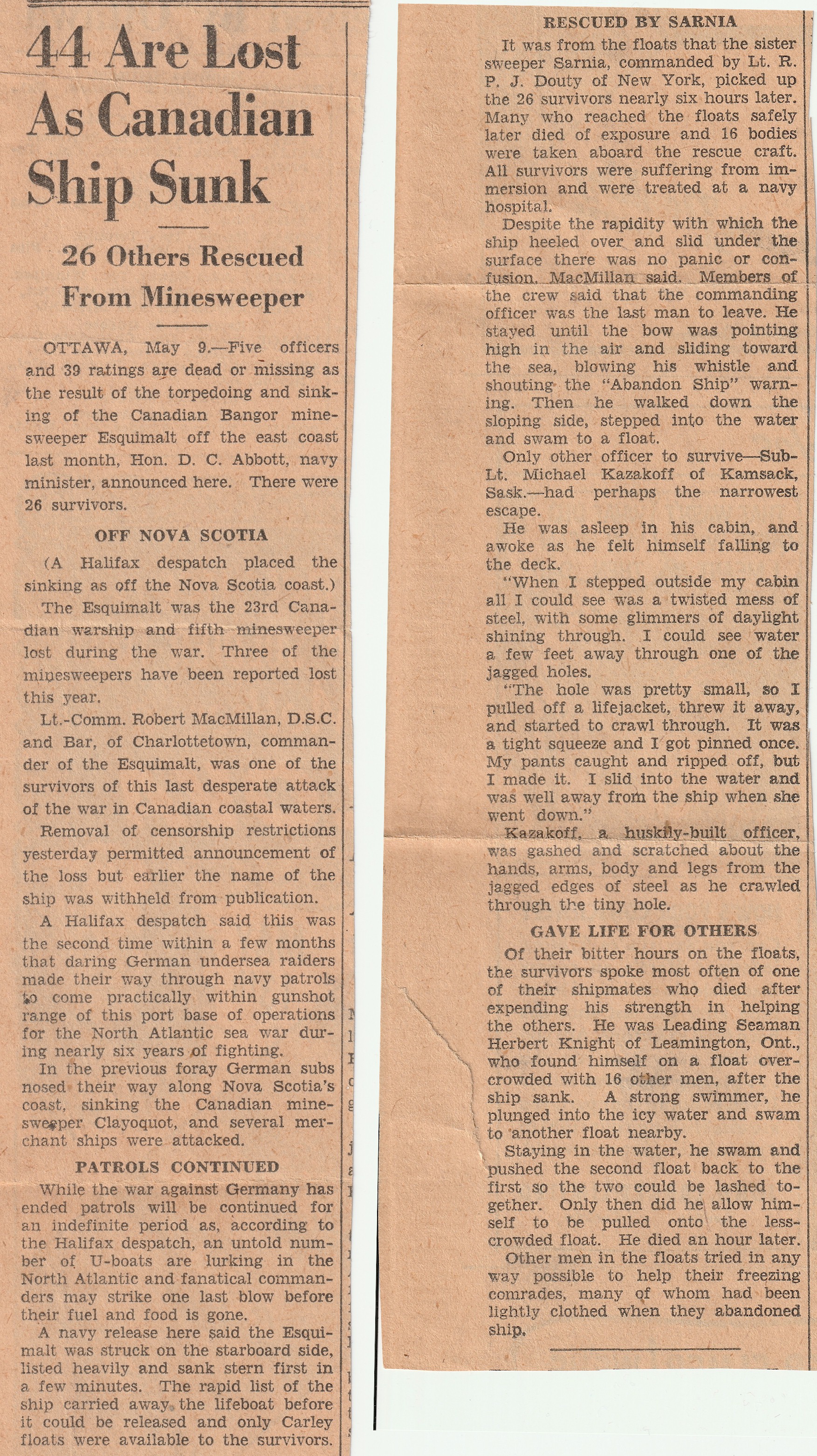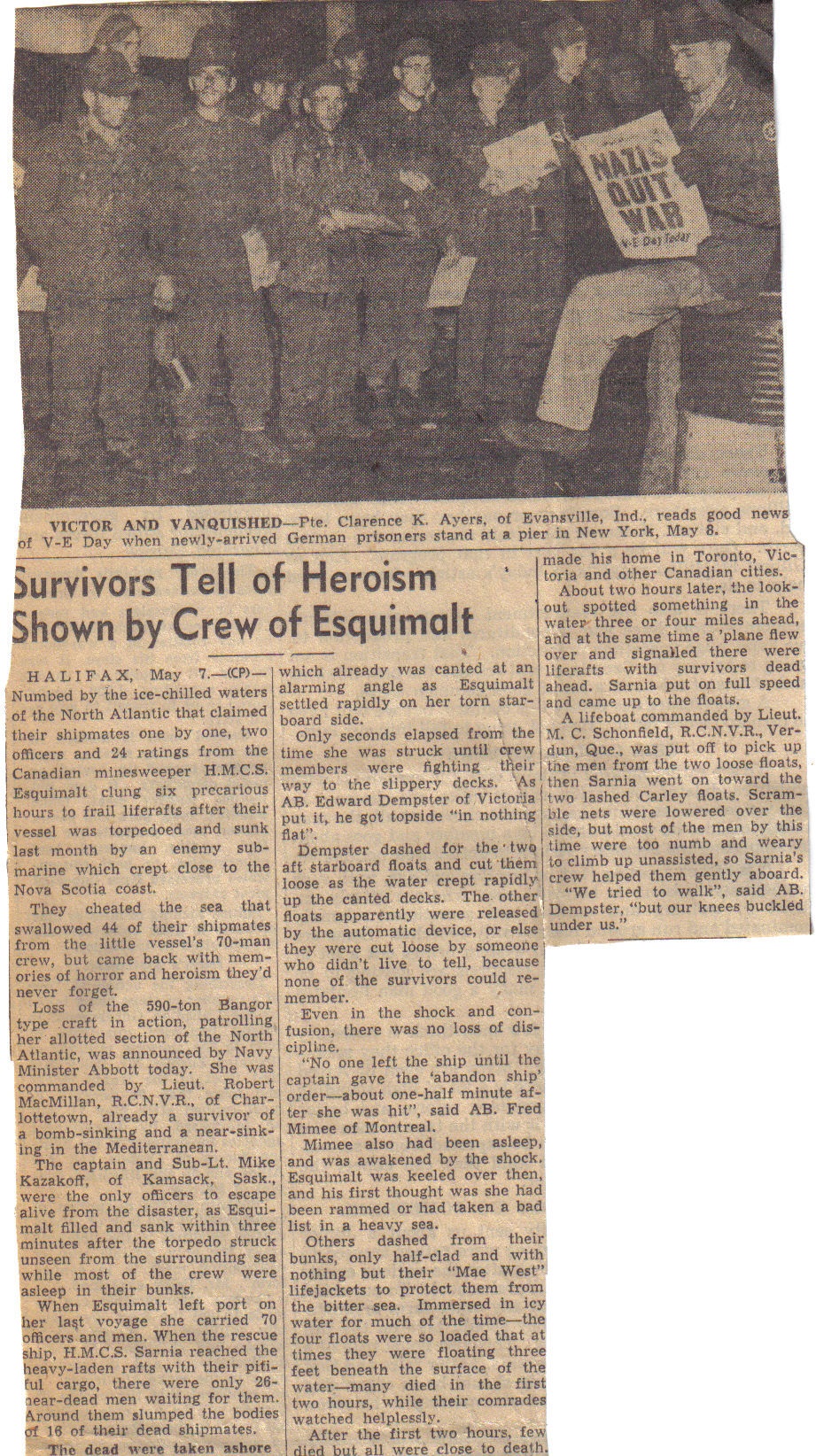 Newspaper article - Survivor stories from the sinking of HMCS ESQUIMALT