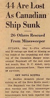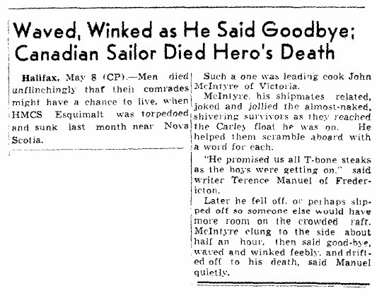 Newspaper article on the death of L/Cook Thomas McIntyre after the sinking of HMCS ESQUIMALT