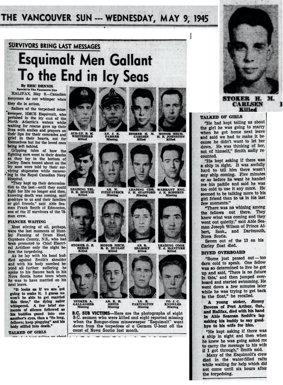 Article on the loss of HMCS ESQUIMALT with photos of those from BC