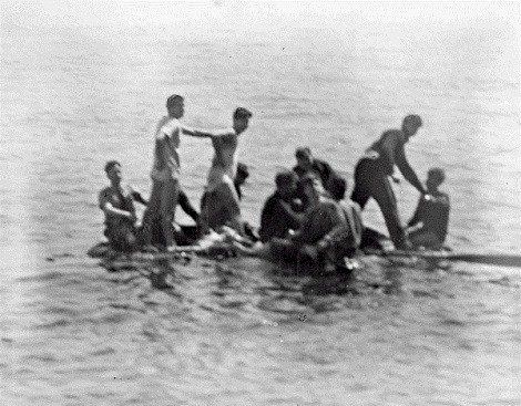 (HF65) HMCS ESQUIMALT'S survivors on a raft.  On the back of the photo - "I am sitting in the middle, Joe Wilson on the stern, only six of us were alive when the Sarnia came alongside and Joe and I told the Sarnia to get the others first."