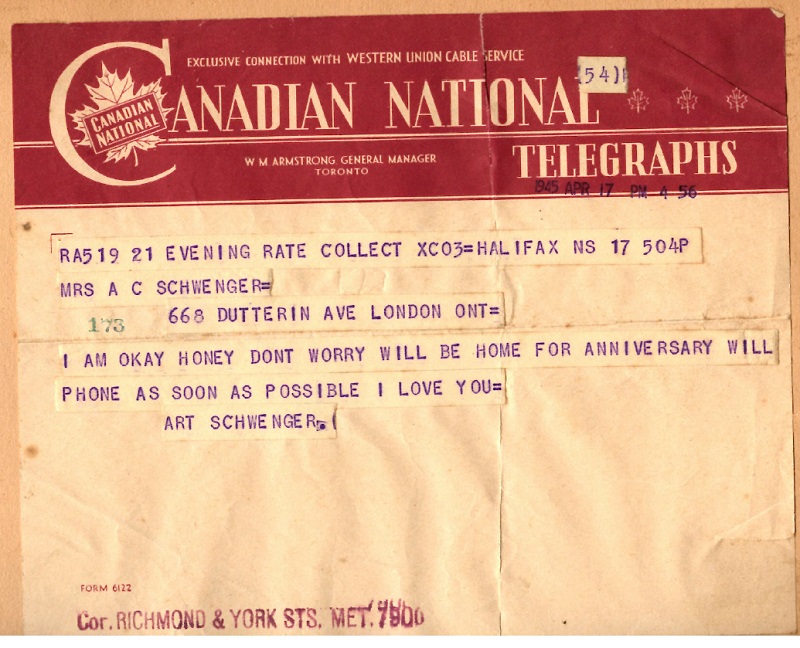 Arthur Schwenger survived the sinking of HMCS ESQUIMALT.  This is a telegram from Arthur Schwenger to his wife letting her know that he was alright.