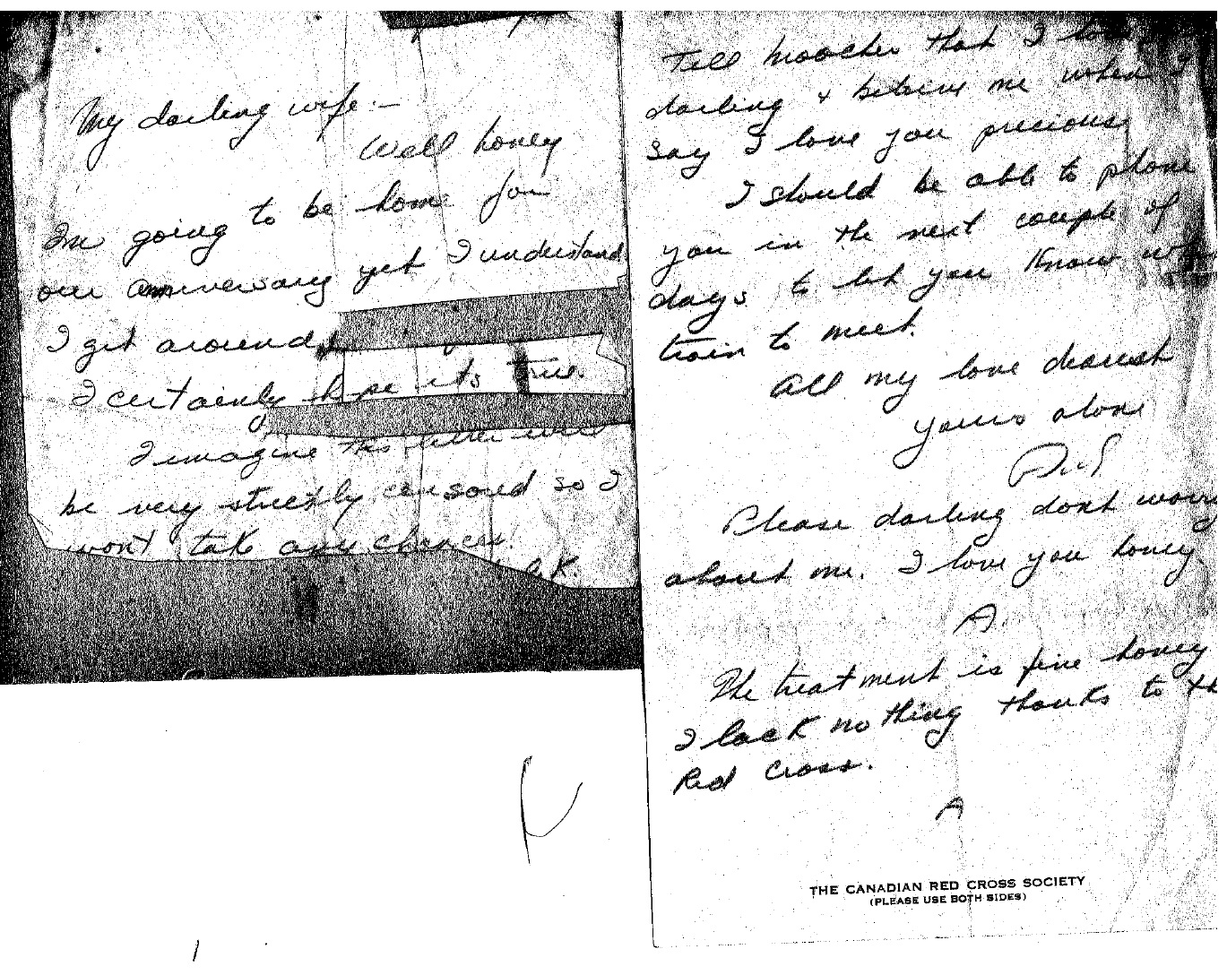 Letter from Art Schwenger that was written on Red Cross Hospital stationary. He was writing to his "darling wife" and you can see that it was censored with pieces cut out of it. In the letter, he refers to "Moocher" which was his pet name for his daughter Sharon.