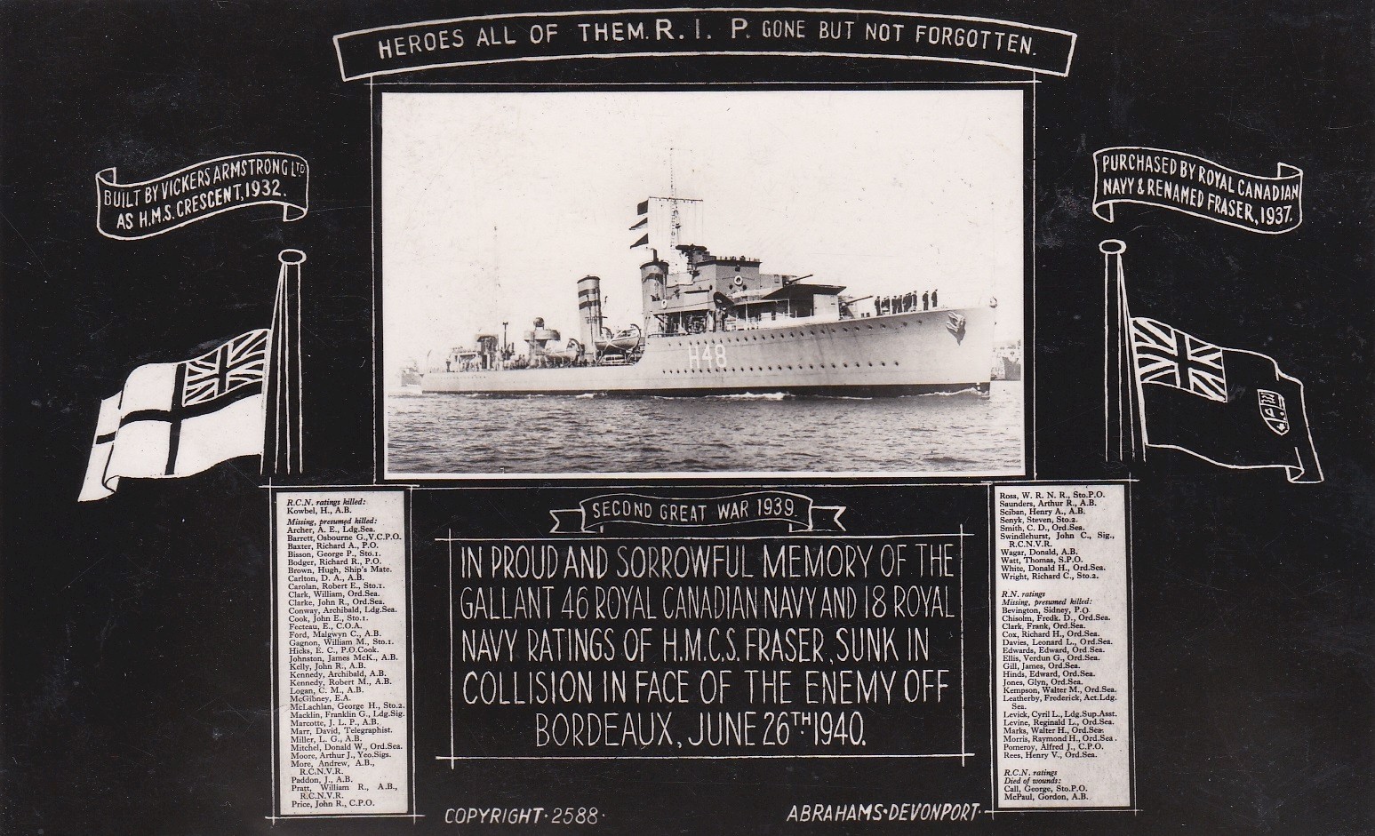 In the latter part of May, 1940, FRASER was one of the Canadian destroyers sent overseas. Following her arrival, she was assigned mainly to convoy duties, including the escort of troopships carrying Canadian soldiers to the United Kingdom.