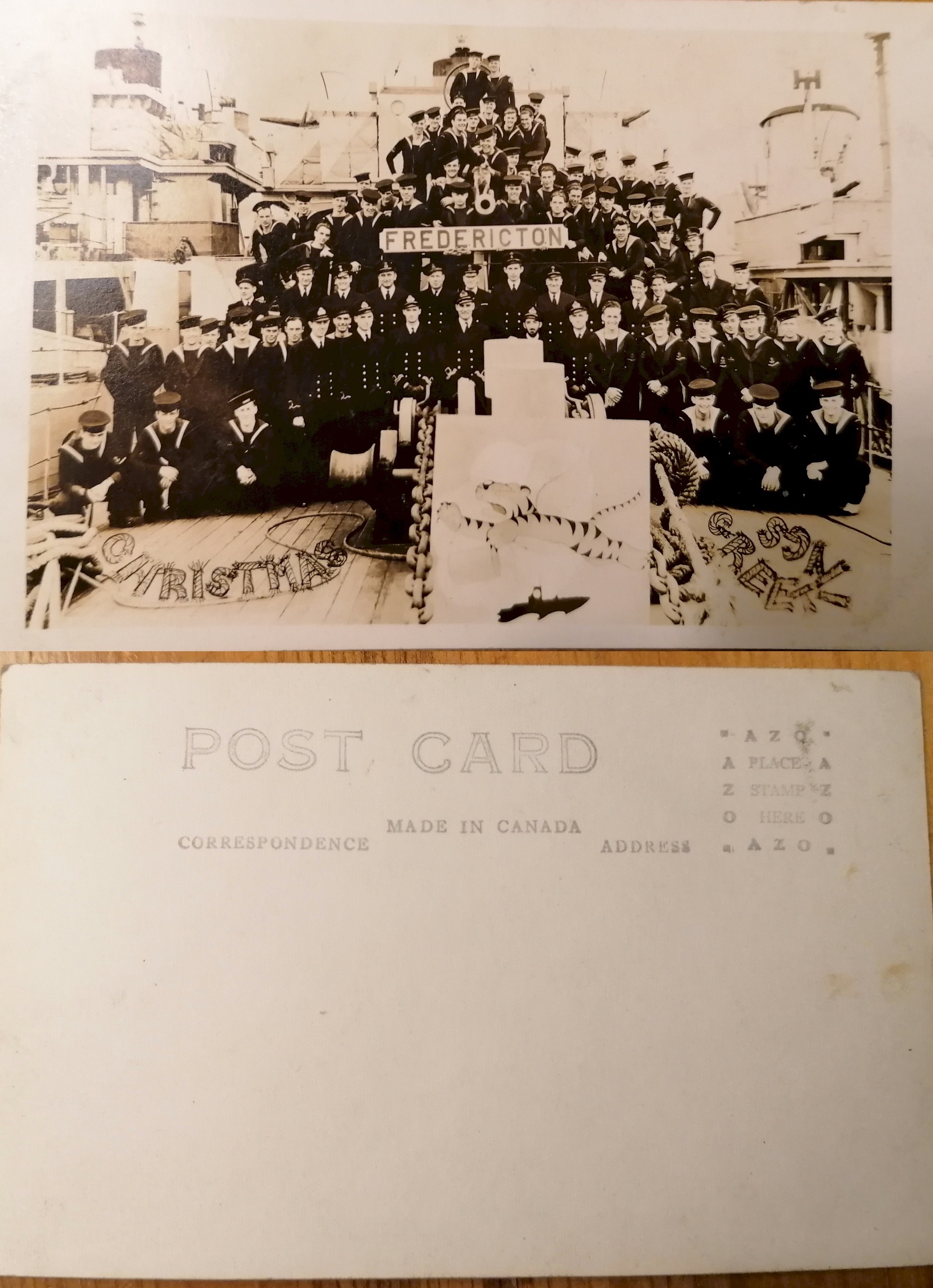 (FRD001) HMCS FREDERICTON K245 jacket patch (FRD002) HMCS FREDERICTON K245 Christmas postcard // Courtesy of Perry Hodder (FRD003) HMCS FREDERICTON K245 - iced up // From the collection of James Finlay, Stoker P.O., RCNVR // Courtesy of Tom Gaylor (FRD004) HMCS FREDERICTON K245 // From the collection of James Finlay, Stoker P.O., RCNVR // Courtesy of Tom Gaylor (FRD005) HMCS FREDERICTON K245 at sea with EG C-4 Dec 1943 // LAC a161383