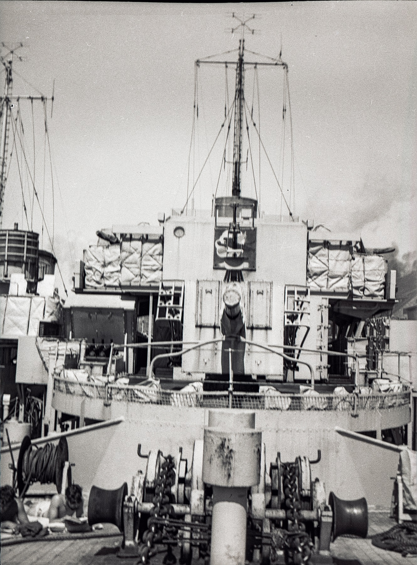(CA153-CA155) Fo'c's'le and gun deck of HMCS FREDERICTON K245 - North Atlantic (CA156) Minesweeping gear on HMCS FREDERICTON K245 (CA157) Starboard side of HMCS FREDERICTON K245 looking aft from the boat deck