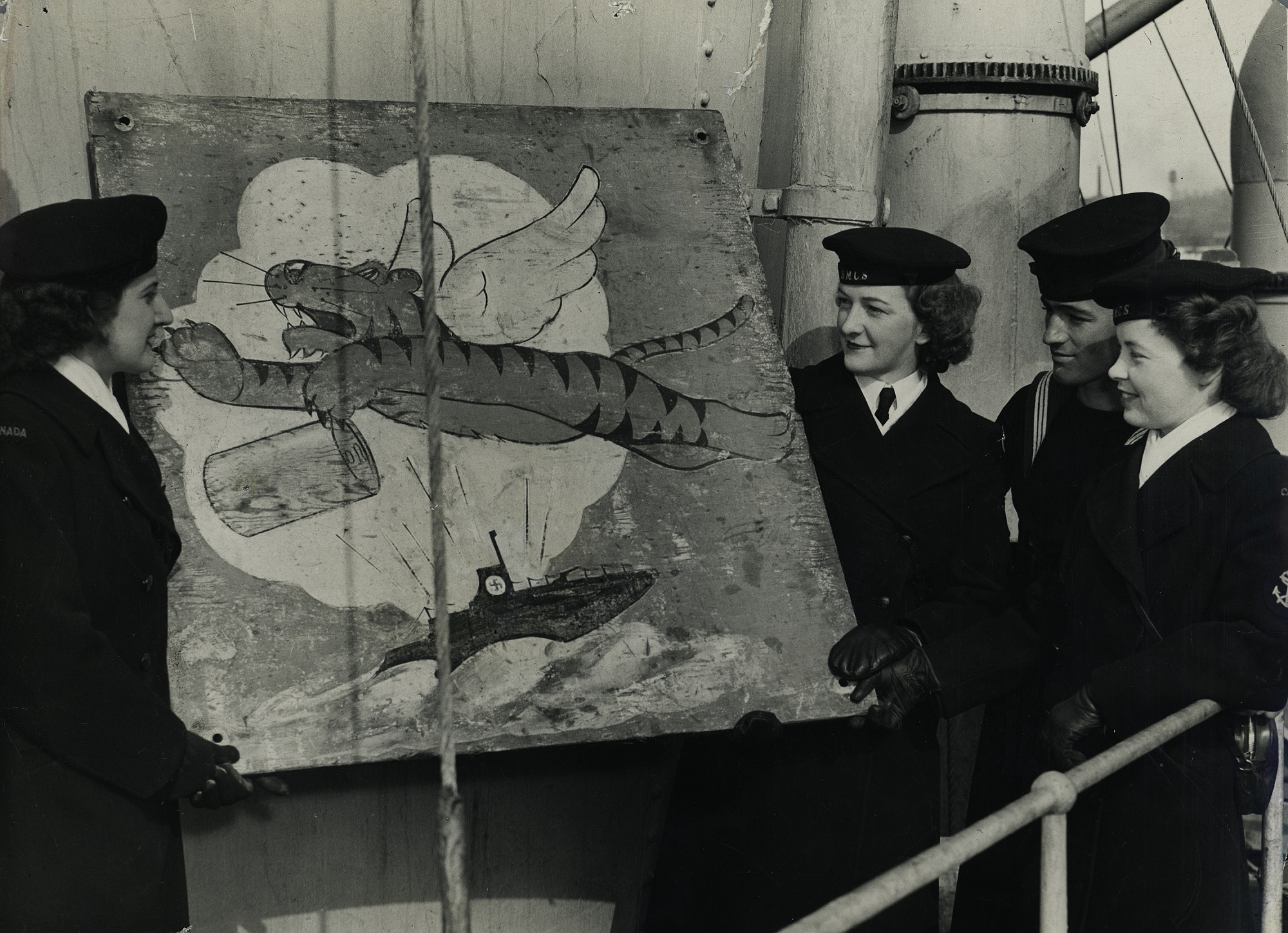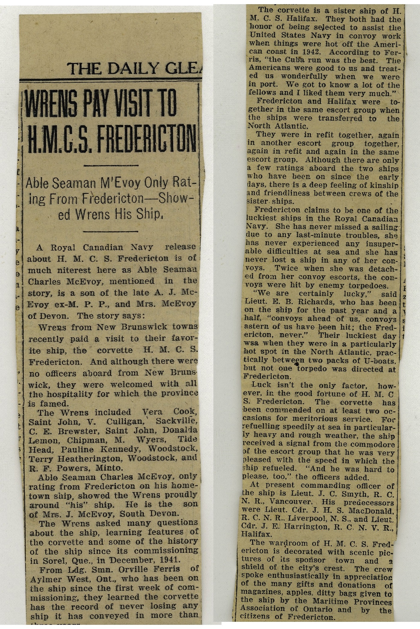 (CM01-CM02) HMCS FREDERICTON K245 (CM03) HMCS FREDERICTON'S mascot - name not known) (CM04) AB Charles McEvoy with 3 Wren's posing with FREDERICTON'S gunshield art (CM05) Newspaper article on Wrens visiting HMCS FREDERICTON with AB Charles McEvoy as their tour guide on ship