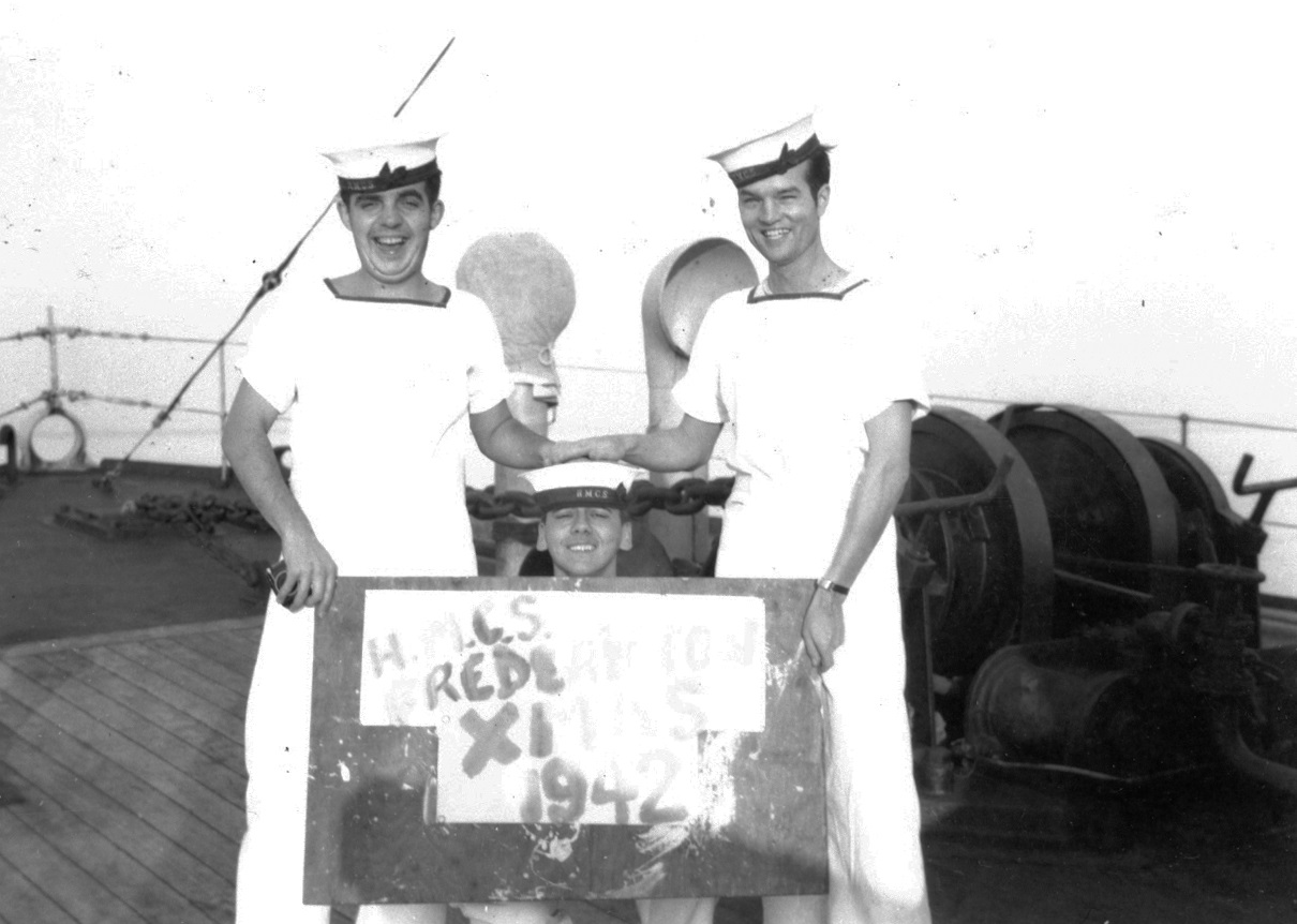 (CA36) HMCS FREDERICTON K245 Ship's Company Photo - Christmas 1942 (CA37) Unknown Leading Seaman on HMCS FREDERICTON K245 - Christmas 1942 (CA38) L-R: Charles Atkins (centre) and one of the other 2 sailors is named Holton on HMCS FREDERICTON K245 - Christmas 1942 (CA39) Charles Atkins, (back, centre) with unknown shipmates on HMCS FREDERICTON K245 - Christmas 1942