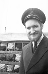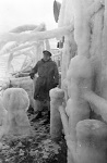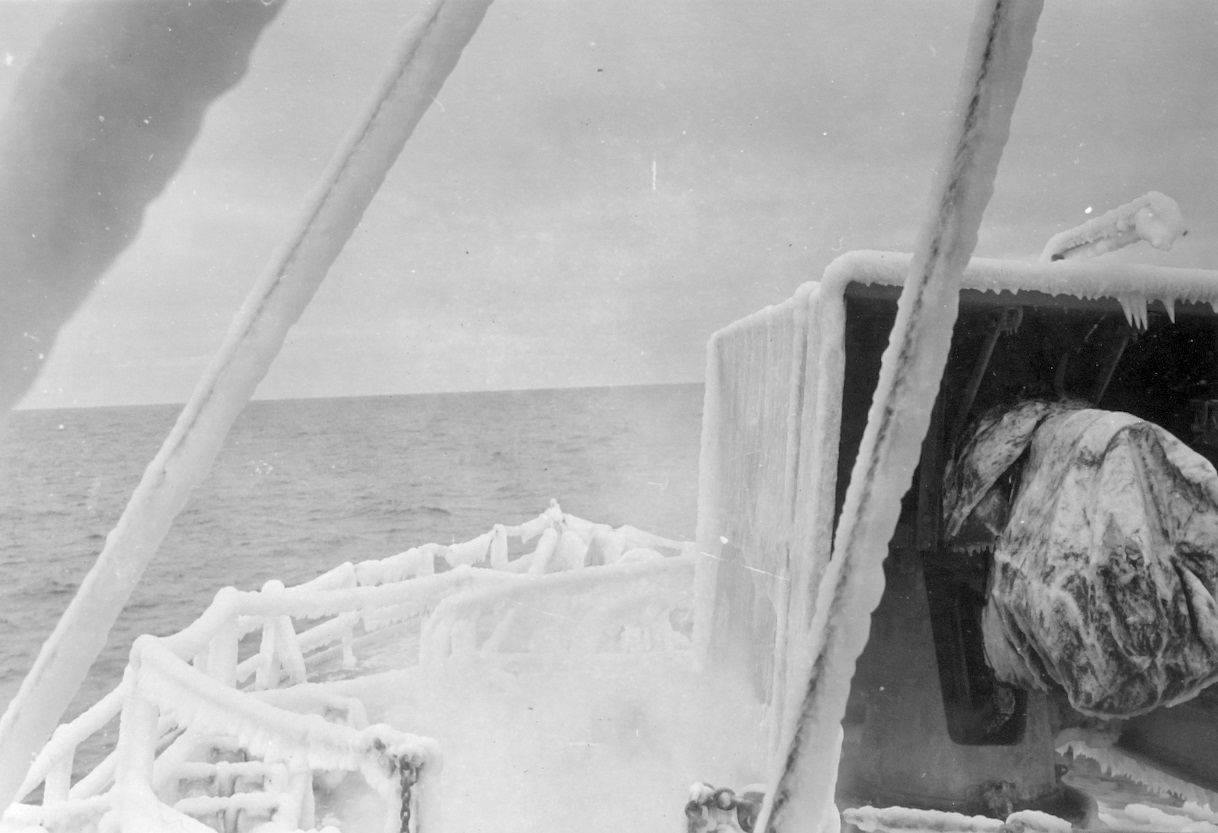 (CA167-CA171) HMCS FREDERICTON K245 heavily iced-up after a winter crossing in the North Atlantic (CA171) Unknown officer on the boat deck of HMCS FREDERICTON K245