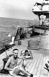 (CA79) Sailors on the fo'c's'le of HMCS FREDERICTON K245. Charles Atkins, rear, 1st on left (CA80) Sailors taking in the Caribbean sun on the fo'c's'le of HMCS FREDERICTON K245 (CA81) HMS ILEX I61 at anchor, Cuba (CA82-CA83) Aircraft taking off in harbour, Cuba