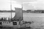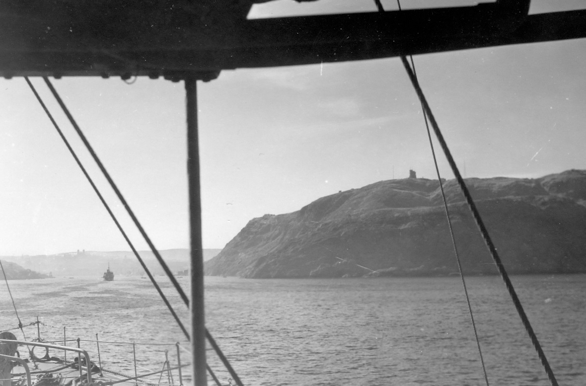 (CA134) Fishing schooner off the coast of Newfoundland (CA135) HMCS FREDERICTON K245 approaching the entrance to St. John's Harbour. Cabot Tower can bee seen on the left (CA136) HMCS FREDERICTON K245 transiting the narrows in the St. John's Harbour (CA137-CA138) HMS MOYLA K260 in harbour at St. John's