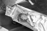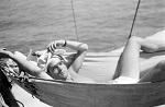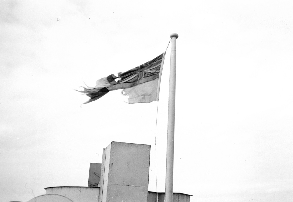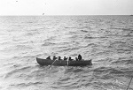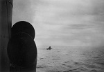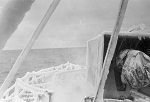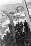 (CA99) Seymour with his mic slung on the upper decks on HMCS FREDERICTON K245 (CA100) Unknown sailor sleeping in his mic, slung on the upper decks, on HMCS FREDERICTON K245 (CA101) Fraser asleep in his mic on the upper decks at sea on HMCS FREDERICTON K245 while another sailor slings his mic (CA102) HMCS FREDERICTON'S boat swung out ready for use. A sailor is in the boat checking the lines. (CA103) A tattered ensign flying from HMCS FREDERICTON K245
