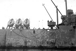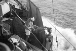 (CA163-164) HMCS FREDERICTON K245 receiving depth charges from a merchant ship by jackstay (CA165) Unknown sailor on look-out by an Oerlikon on HMCS FREDERICTON K245 (CA166) Unknown sailors on the bridge wing of HMCS FREDERICTON K245