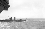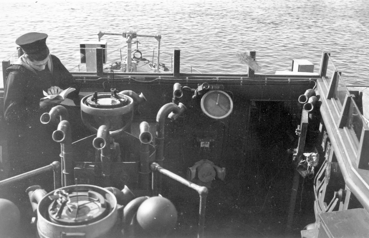 (CA182) Unknown allied submarine astern of HMCS FREDERICTON K245 (CA183) Seymour looking out a scuttle on HMCS FREDERICTON K245 (CA184) Unknown sailors looking out the scuttle on HMCS FREDERICTON K245 (CA185) Unknown officer on HMCS FREDERICTON K245