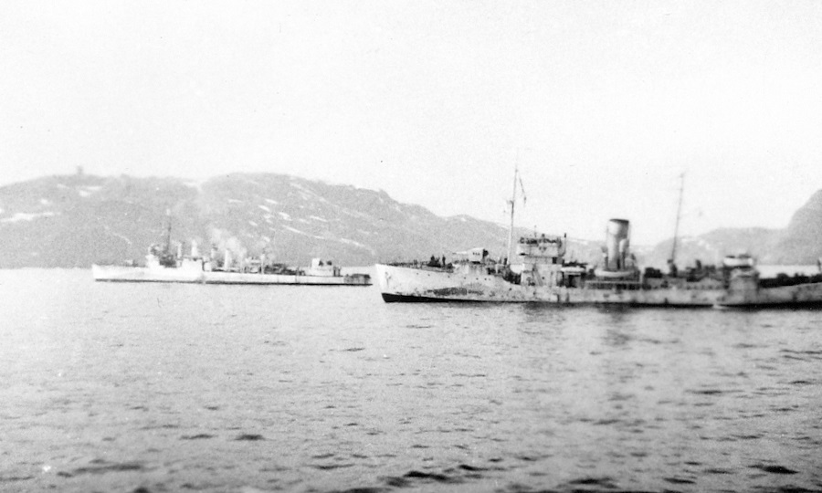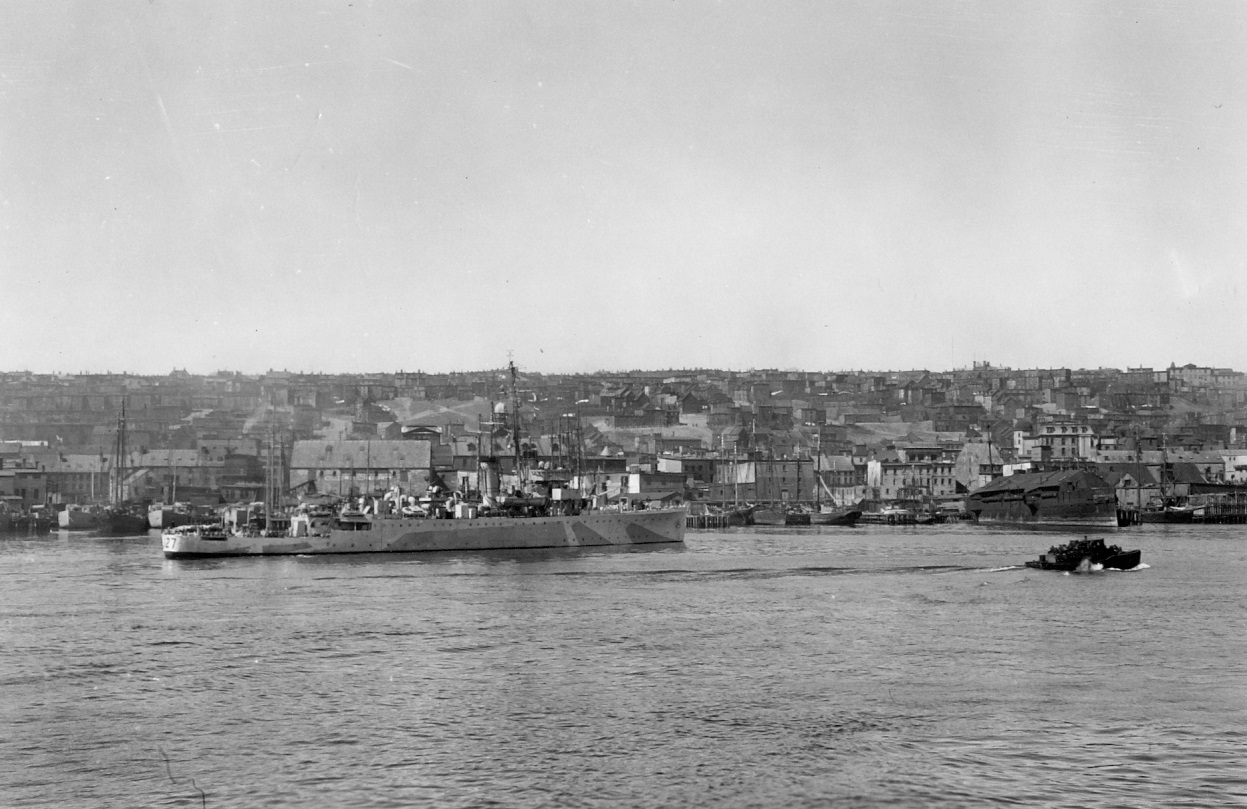 (CA176) Unknown River class destroyer (left) and the corvette HMCS MATAPEDIA K112 in the approaches to St. John's, Nfld. Cabot Tower visible on the upper left of the shore (CA177) HMCS OAKVILLE K178 (CA178) Corvettes in line ahead formed up astern of HMCS FREDERICTON K245