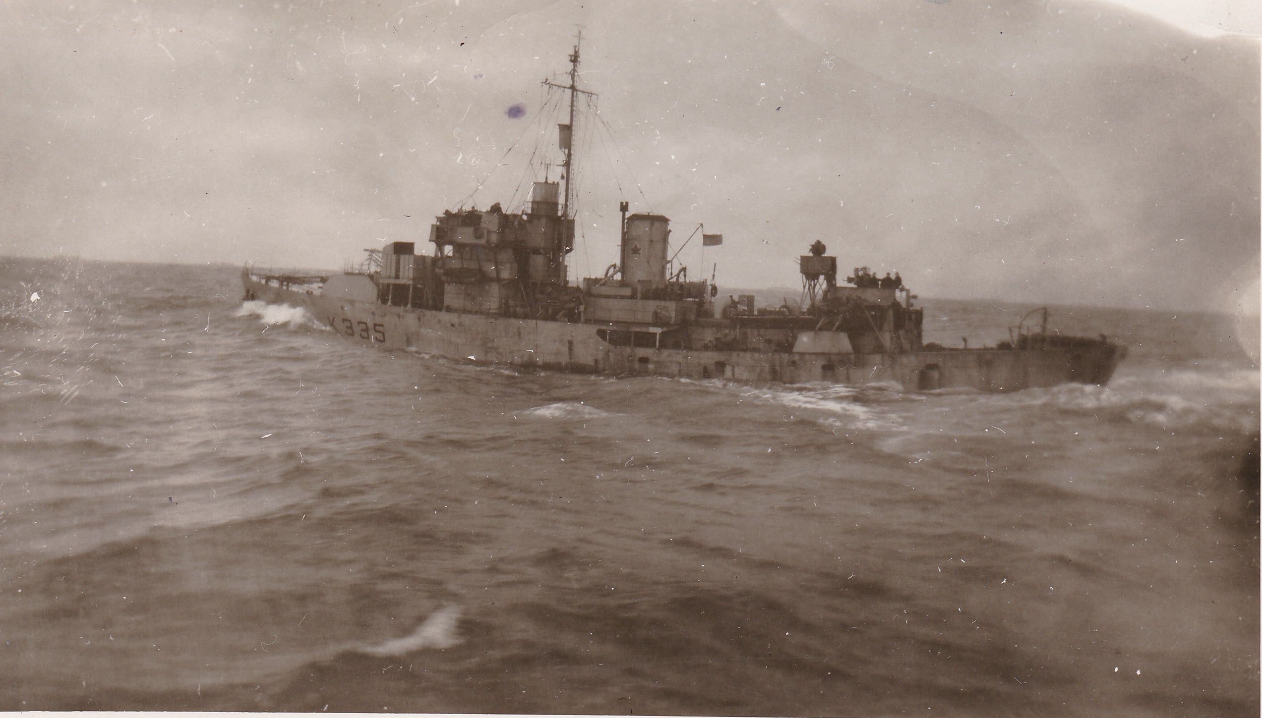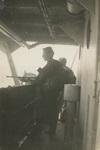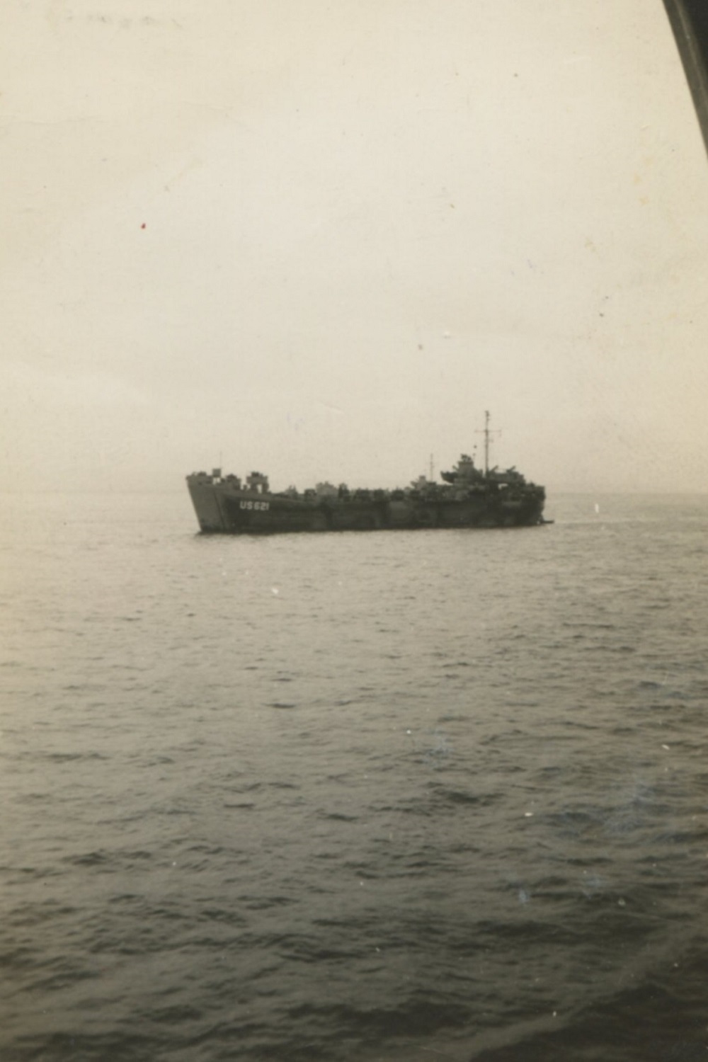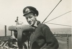 (GS43) Gilbert Smith (2nd from right) and shipmates on HMCS FRONTENAC K335 (GS44) Unidentified sailor on the after signal lamp / searchlight tower on HMCS FRONTENAC K335 (GS45) Unidentified sailor holding a machine gun on HMCS FRONTENAC K335 (GS46) US Landing Craft 621 (GS47) Coder Gilbert Smith with mascot "Count FRONTENAC" on HMCS FRONTENAC K335