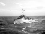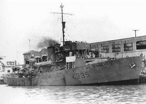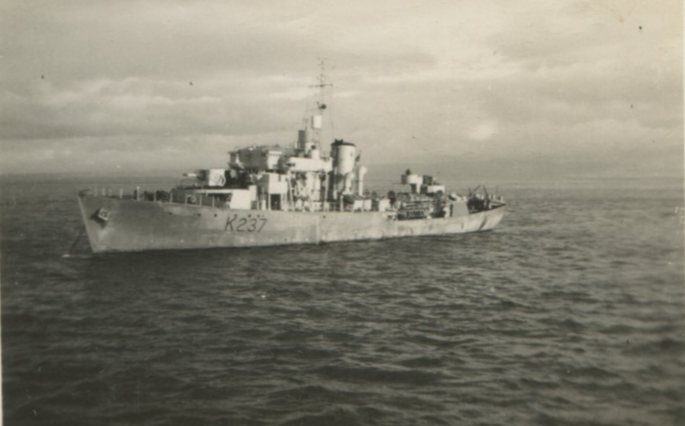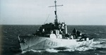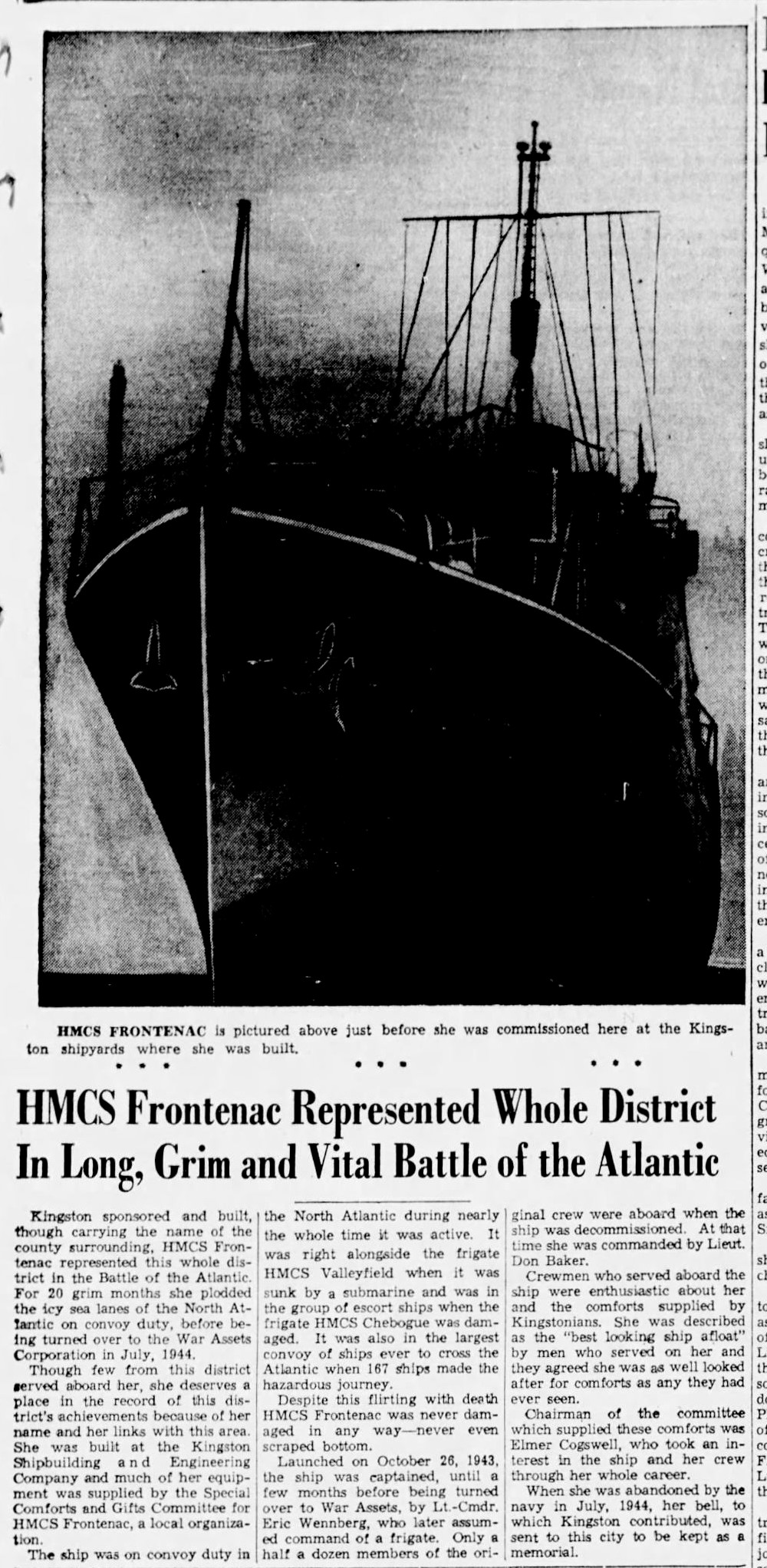 Built at Kingston, Ont., FRONTENAC was commissioned there on 26 Oct 1943. She arrived at Halifax in mid-Dec 1943 and carried out working-up exercises in St. Margaret's Bay in Jan 1944. She was then assigned to EG 9, Londonderry, and made the crossing in Mar 1944 as escort to convoy SC.154. It was decided, however, the EG 9 should be made up only of frigates, and FRONTENAC returned to St. John's where in May 1944 she joined EG C-1. She left Belfast 19 Dec 1944 to escort ON.273, her last westbound convoy. On 05 Jan 1945 she commenced refit at Liverpool, N.S. On completion on she was assigned to Halifax Force and sent to Bermuda to work up, but saw little further service before being paid off at Halifax on 22 Jul 1945. She was then taken to Sorel, but was sold in Oct 1945 to the United Ship Corp. of New York.