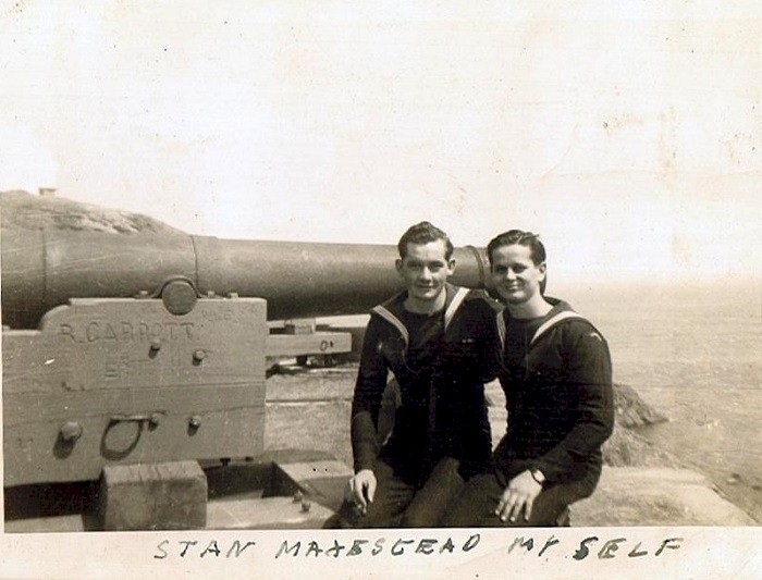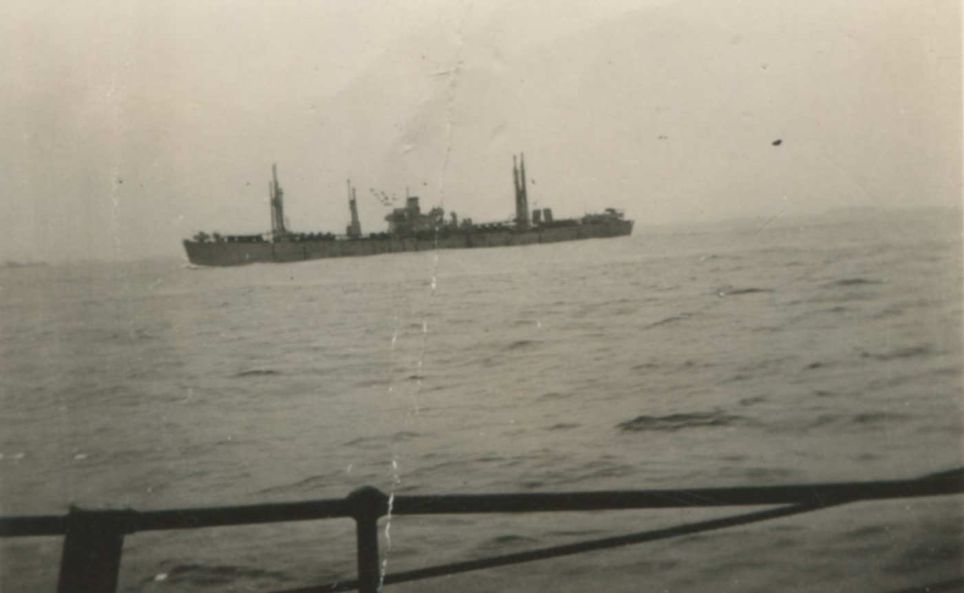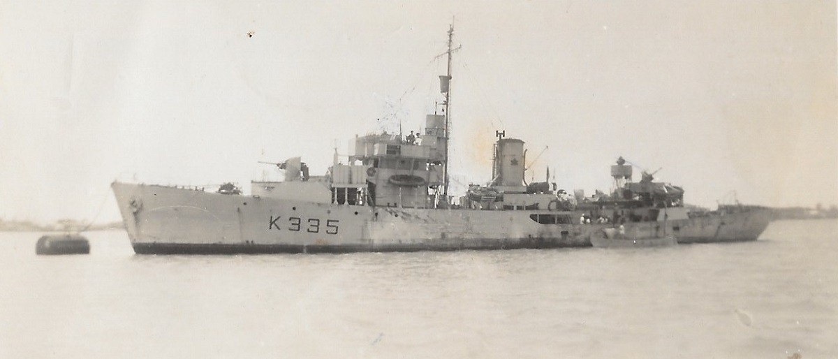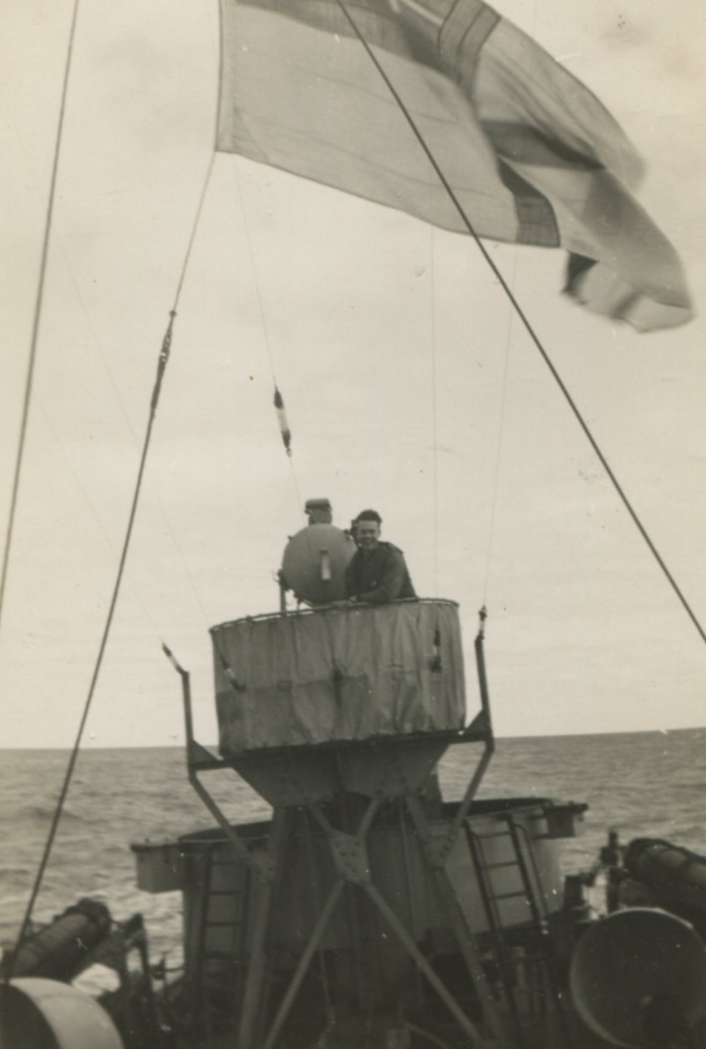 (GS33) Unidentified sailors on HMCS FRONTENAC K335 (GS34) Unknown ship - possibly a troop ship (GS35) Unidentified sailor leaning on the rocket launcher on HMCS FRONTENAC K335 (GS36) Ships in convoy (GS37) Gilbert Smith (right) on HMCS FRONTENAC K335