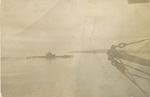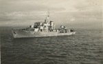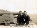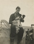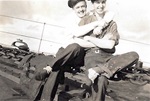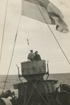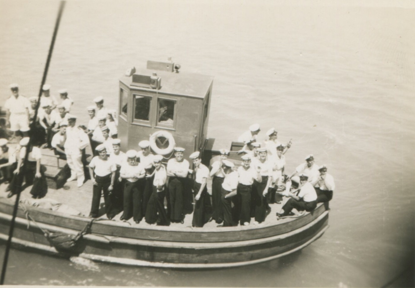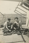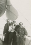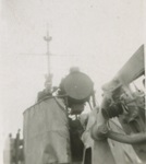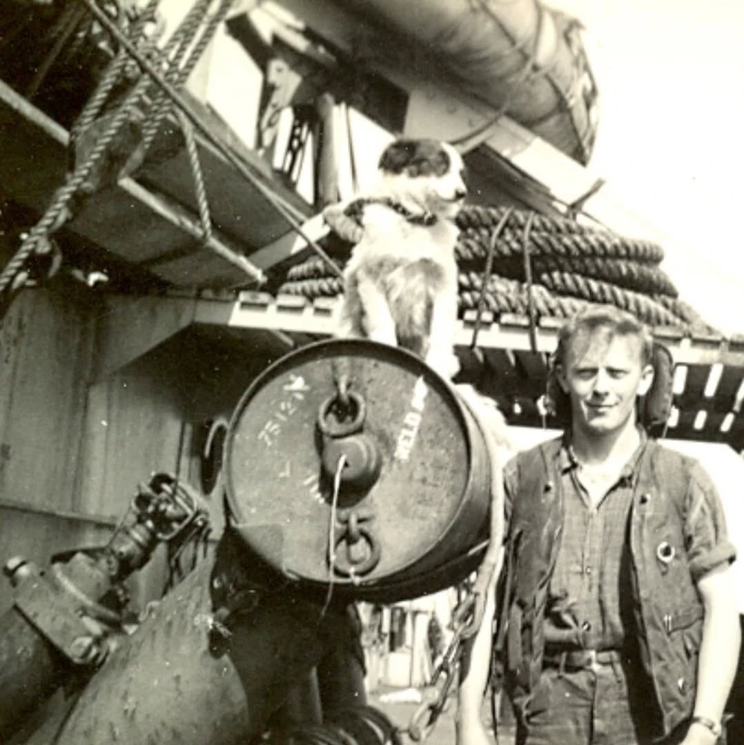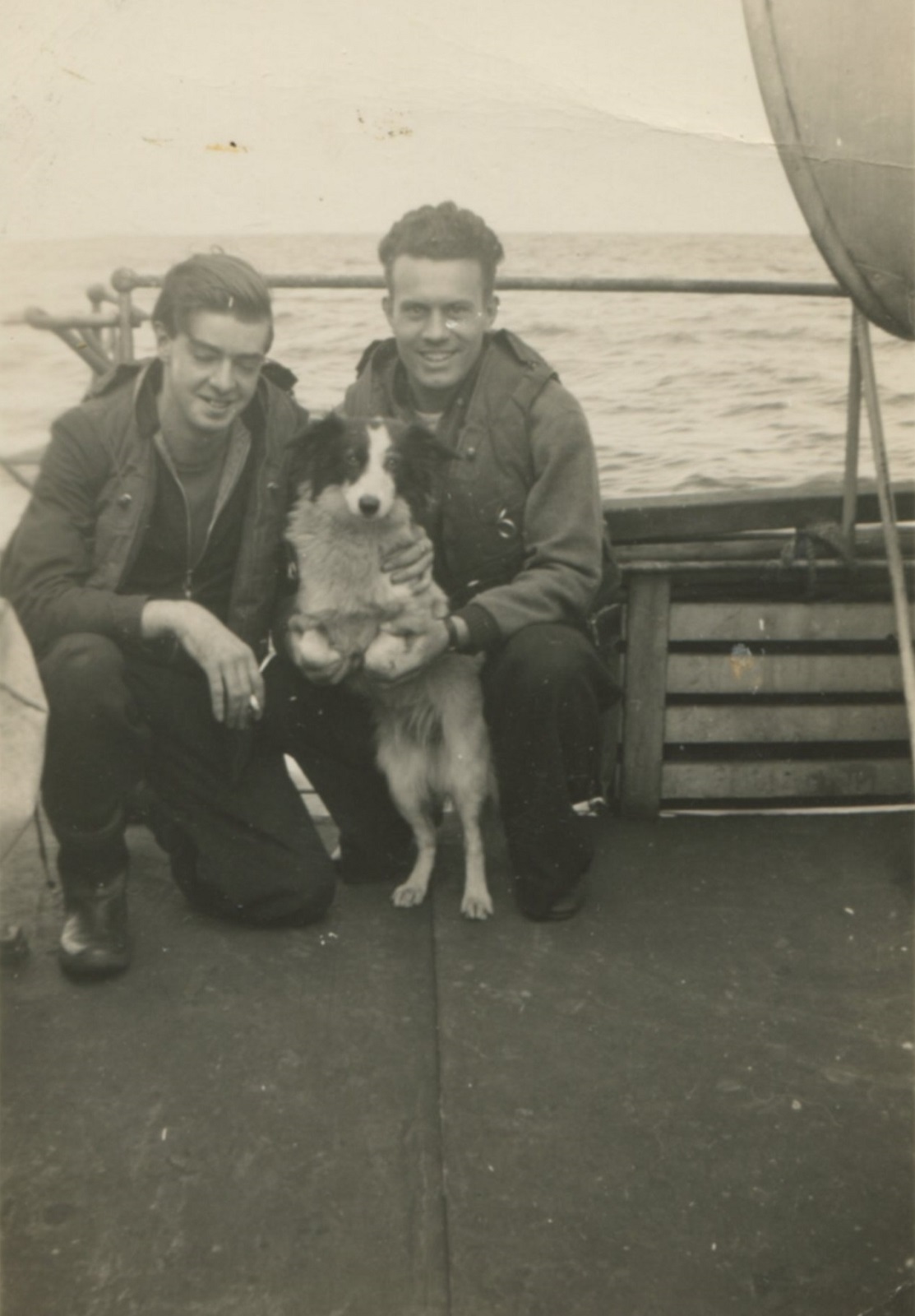 (GS48) Coder Gilbert Smith (left) and shipmate with mascot "Count FRONTENAC" on HMCS FRONTENAC K335 (GS49) Unidentified sailors relaxing by the forward gun on HMCS FRONTENAC K335 - note convoy ships in background (GS50) Gilbert Smith (centre) and shipmates by depth charge thrower on HMCS FRONTENAC K335 (GS51-GS52) Sailors on duty boat either leaving from or returning to HMCS FRONTENAC K335
