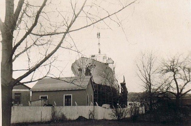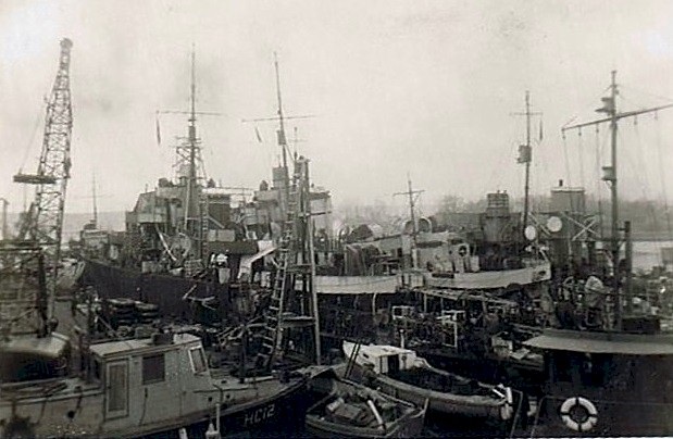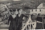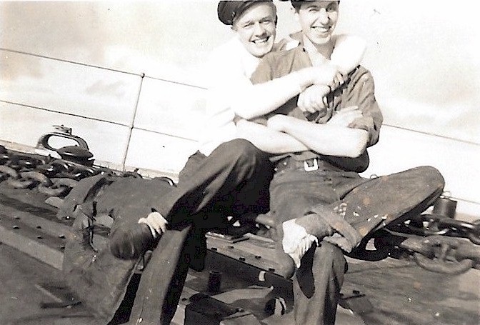 (JB16) Stan Matestead and John Boothman (JB17) Refit Base (JB18-JB19) HMCS FRONTENAC on the slips. FRONTENAC was in refit at Liverpool, NS from Jan to Mar 1945 (JB20) Troopship seen from HMCS FRONTENAC
